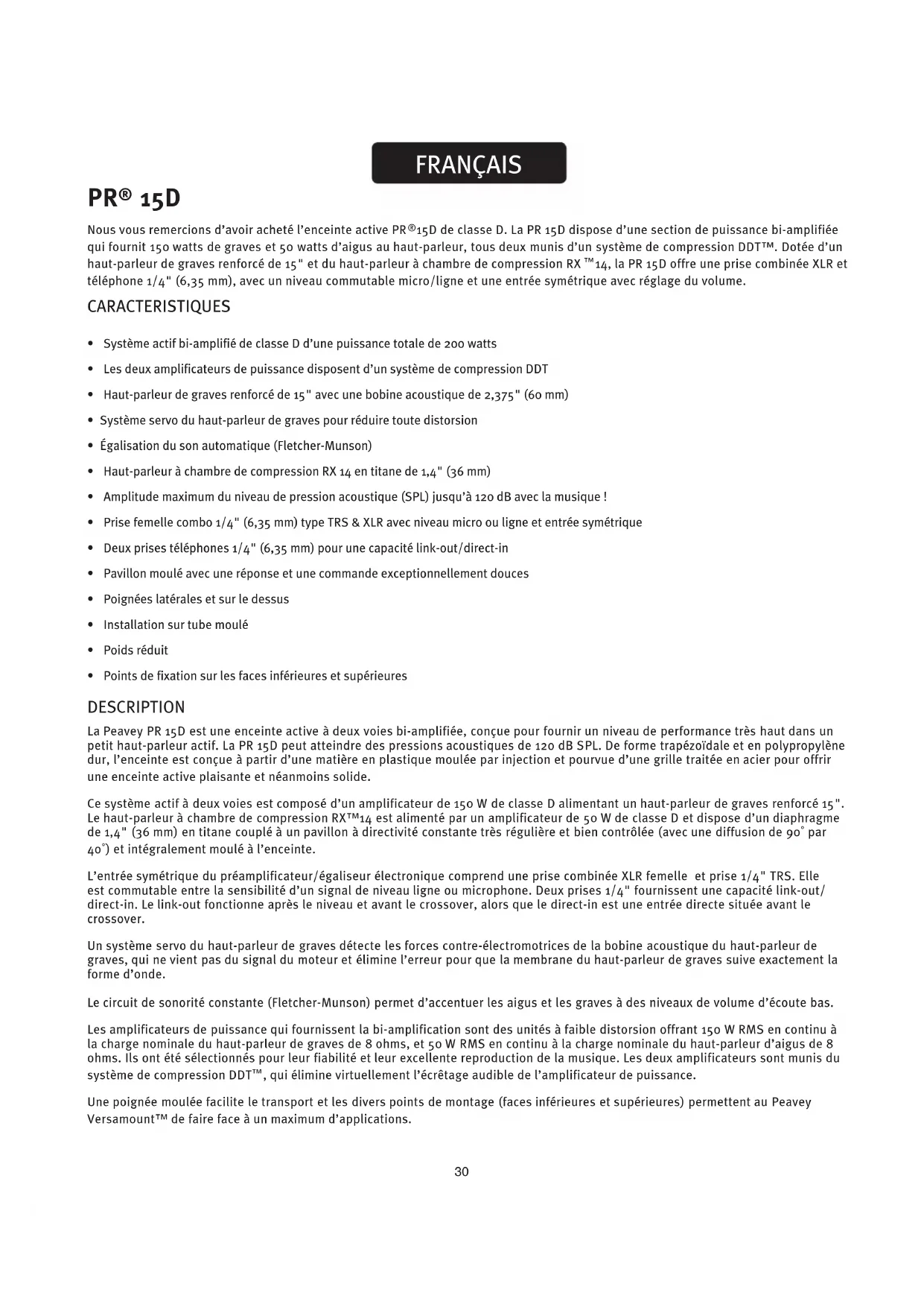 - Pointsdefixationsurlesfacesinférieuresetsupérieures DESCRIPTION La Peavey PR 15D est une enceinte active à deux voies bi-amplifiée, conçue pour fournir un niveau de performance très haut dans un petithaut-parleuractif.LaPR15Dpeutatteindredespressionsacoustiquesde120dBSPL.Deformetrapézoïdaleetenpolypropylène dur,l’enceinteestconçueàpartird’unematièreenplastiquemouléeparinjectionetpourvued’unegrilletraitéeenacierpouroffrir une enceinte active plaisante et néanmoins solide. Ce système actif à deux voies est composé d’un amplificateur de 150 W de classe D alimentant un haut-parleur de graves renforcé 15". Le haut-parleur à chambre de compression RX™14 est alimenté par un amplificateur de 50 W de classe D et dispose d’un diaphragme de 1,4" (36 mm) en titane couplé à un pavillon à directivité constante très régulière et bien contrôlée (avec une diffusion de 90˚ par 40˚) et intégralement moulé à l’enceinte. L’entrée symétriquedupréamplificateur/égaliseurélectroniquecomprenduneprisecombinéeXLRfemelleetprise1/4"TRS.Elle estcommutableentrelasensibilitéd’unsignaldeniveauligneoumicrophone.Deuxprises1/4"fournissentunecapacitélink-out/ direct-in.Lelink-outfonctionneaprèsleniveauetavantlecrossover,alorsqueledirect-inestuneentréedirectesituéeavantle crossover. Un système servo du haut-parleur de graves détecte les forces contre-électromotrices de la bobine acoustique du haut-parleur de graves, qui ne vient pas du signal du moteur et élimine l’erreur pour que la membrane du haut-parleur de graves suive exactement la forme d’onde. Lecircuitdesonoritéconstante(Fletcher-Munson)permetd’accentuerlesaigusetlesgravesàdesniveauxdevolumed’écoutebas. Les amplificateurs de puissance quifournissentlabi-amplificationsontdesunitésàfaibledistorsionoffrant150WRMSencontinuà lachargenominaleduhaut-parleurdegravesde8ohms,et50WRMSencontinuàlachargenominaleduhaut-parleurd’aigusde8 ohms.Ilsontétésélectionnéspourleurfiabilitéetleurexcellentereproductiondelamusique.Lesdeuxamplificateurssontmunisdu système de compression DDT