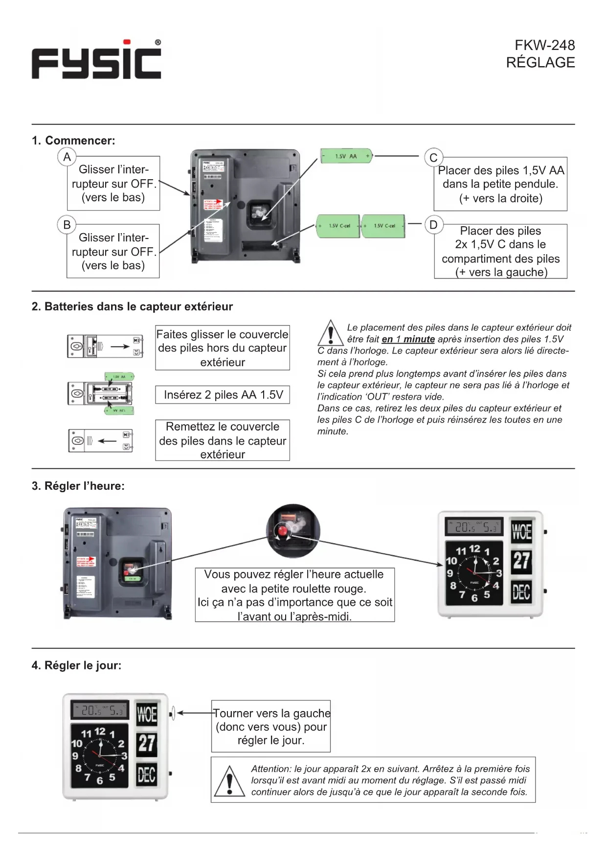Téléchargez la notice de votre Horloge au format PDF gratuitement ! Retrouvez votre notice FKW-248 - Fysic et reprennez votre appareil électronique en main. Sur cette page sont publiés tous les documents nécessaires à l'utilisation de votre appareil FKW-248 de la marque Fysic.