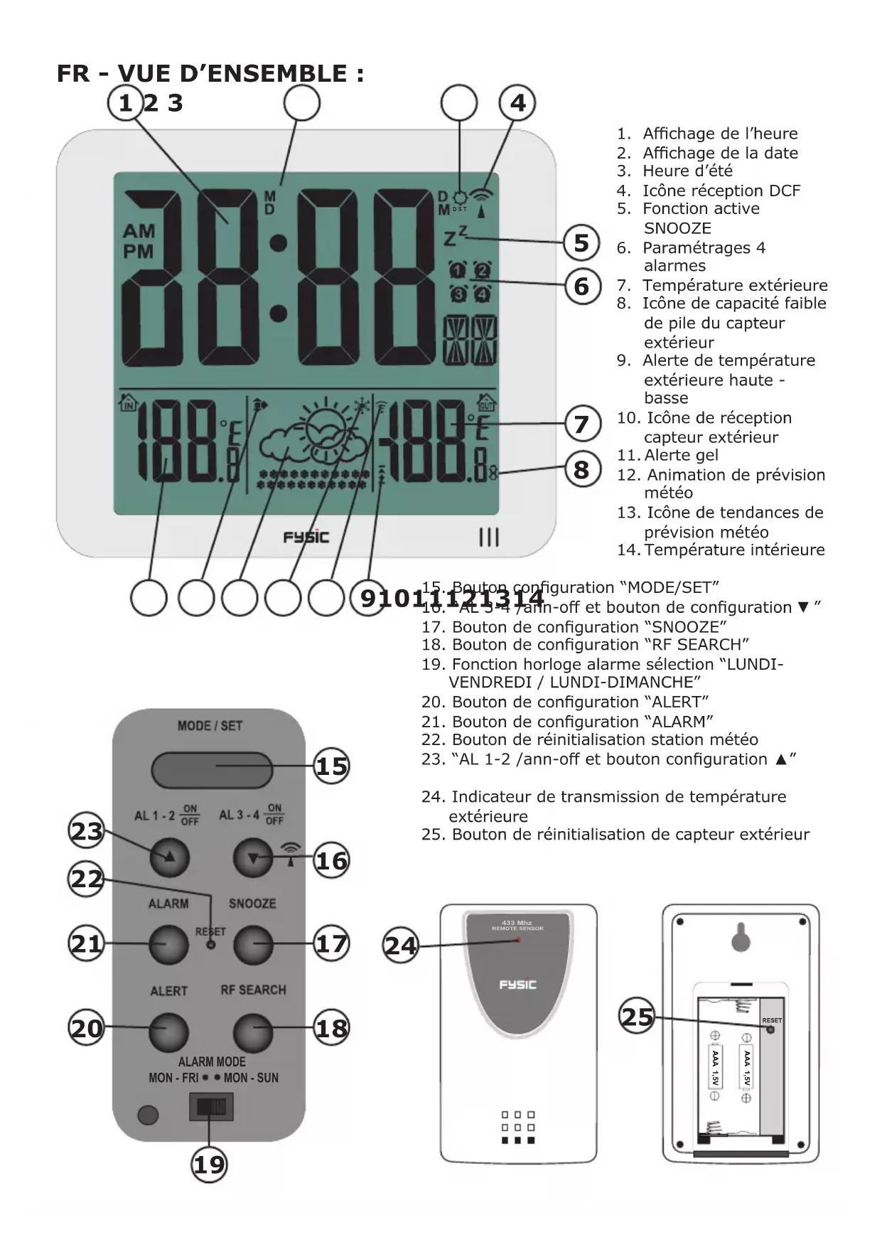 MÉTÈO : Durant une utilisation normale, les données suivantes sont achées : horloge températures intérieure et extérieure animation de prévision météo indicateur de tendance indication de l’heure DCF toutes alarmes actives Achage de l’horloge : Appuyez répétitivement sur le bouton “MODE/ SET”(15) pour l’achage suivant : horloge Horologe + jour date + jour année + jour Indications de tendance du baromètre : La pression de l’air est supérieure comparée à avant La pression de l’air reste la même par rapport à avant La pression de l’air est inférieure comparée à avant Conditions météo : Lorsque l’animation météo montre la pluie, mais qu’un des achages de la température est de dessous de 0°C, l’animation indiquera la neige. Alerte de gel : L’icône alerte de gel apparaît à l’achage lorsque la température extérieure est entre -2°C et +3°C. Pour manuellement rechercher le capteur extérieur : Appuyez et restez appuyé sur le bouton “RF SEARCH”(15) pendant au moins 2 secondes jusqu’à ce que la valeur du capteur extérieur commence à clignoter. La station météo commencera alors à rechercher de nouveau le capteur extérieur. D S TPour manuellement rechercher le DCF : Appuyez et restez appuyé sur le bouton “AL-3 - 4 “ pendant au moins 2 secondes jusqu’à ce que l’icône d’heure DCF commence à clignoter. La station météo va à présent essayer à nouveau de recevoir le signal DCF. Chaque jour à 3h00 du matin la station météo essaye automatiquement de se synchroniser avec la station DCF-77. RINITIALISATION / PANNE SYSTÈME : Dans le cas où vous avez perdu la vue d’ensemble des paramétrages ou si la station météo montre une erreur possible, il peut être nécessaire de réinitialiser la station météo et le capteur extérieur. Pour plus d’informations, consultez : www.fysic.com CONSEILS DE POSITIONNEMENT :