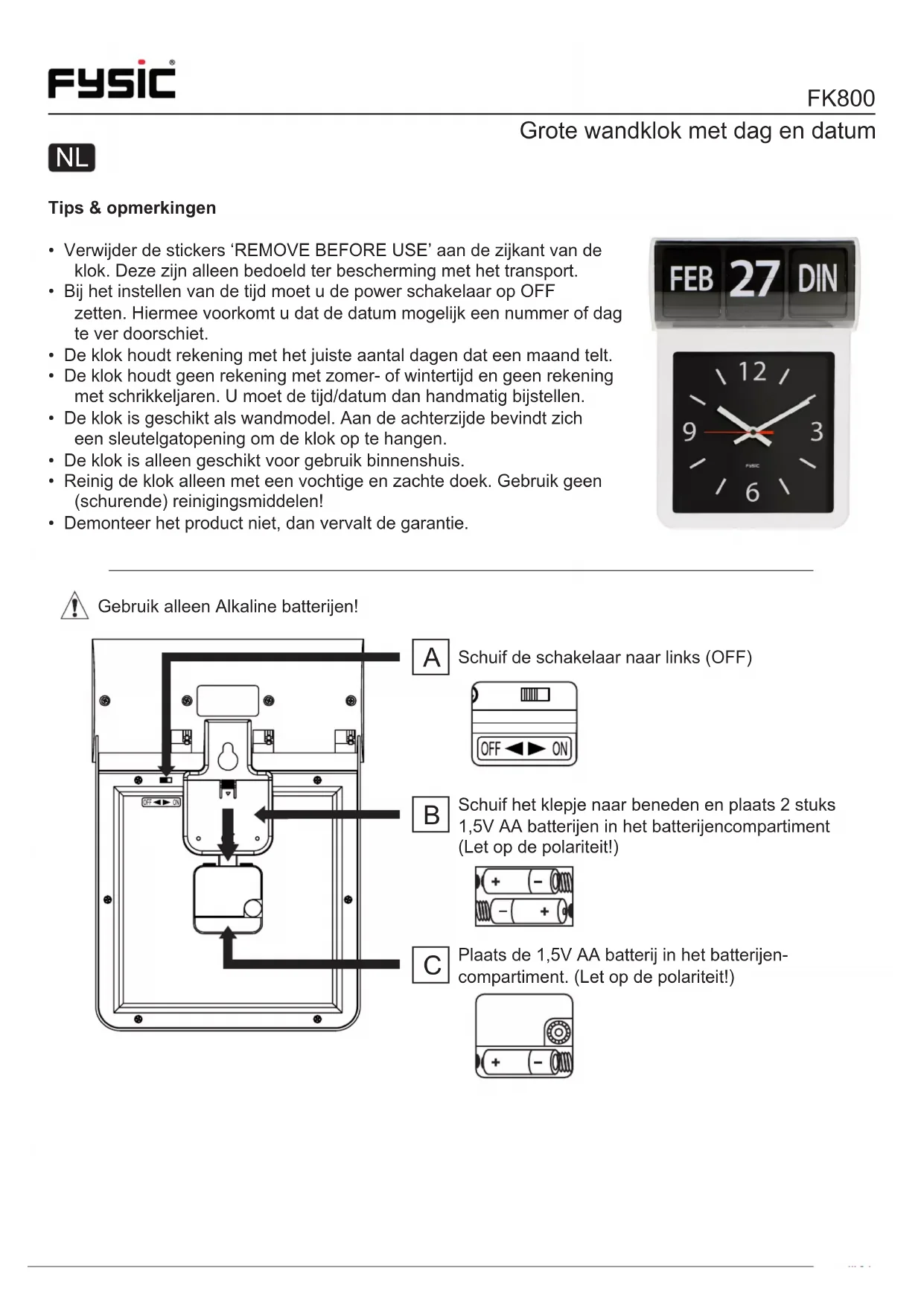 AVOND Ne jetez pas les piles usagées, mais déposez-les à un centre prévu pour les petits déchets chimiques. À la n du cycle de vie de l’appareil, vous ne devez pas le jeter avec les déchets ménagers habituels, mais le déposer à un point de collecte chargé du recyclage des équipements électriques et électroniques. Veillez à bien appuyer sur les boutons du jour, de la date et du mois. Hesdo BV. Aziëlaan 12, 5232 BA ‘s-Hertogenbosch The NetherlandsFK800 Große Uhr mit Wochentags- und Datumsanzeige