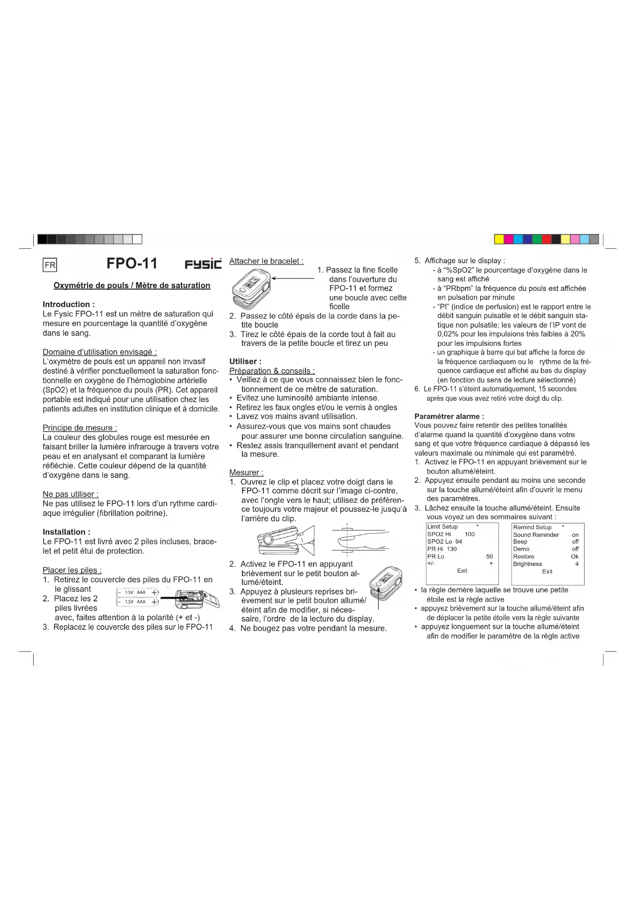 FPO-11 Oxymétrie de pouls / Mètre de saturation Introduction : Le Fysic FPO-11 est un mètre de saturation qui mesure en pourcentage la quantité d’oxygène dans le sang. Domaine d’utilisation envisagé : L’oxymètre de pouls est un appareil non invasif destiné à vérier ponctuellement la saturation fonc- tionnelle en oxygène de l’hémoglobine artérielle (SpO2) et la fréquence du pouls (PR). Cet appareil portable est indiqué pour une utilisation chez les patients adultes en institution clinique et à domicile. Principe de mesure : La couleur des globules rouge est mesurée en faisant briller la lumière infrarouge à travers votre peau et en analysant et comparant la lumière rééchie. Cette couleur dépend de la quantité d’oxygène dans le sang. Ne pas utiliser : Ne pas utilisez le FPO-11 lors d’un rythme cardi- aque irrégulier (brillation poitrine). Installation : Le FPO-11 est livré avec 2 piles incluses, brace- let et petit étui de protection. Placer les piles :