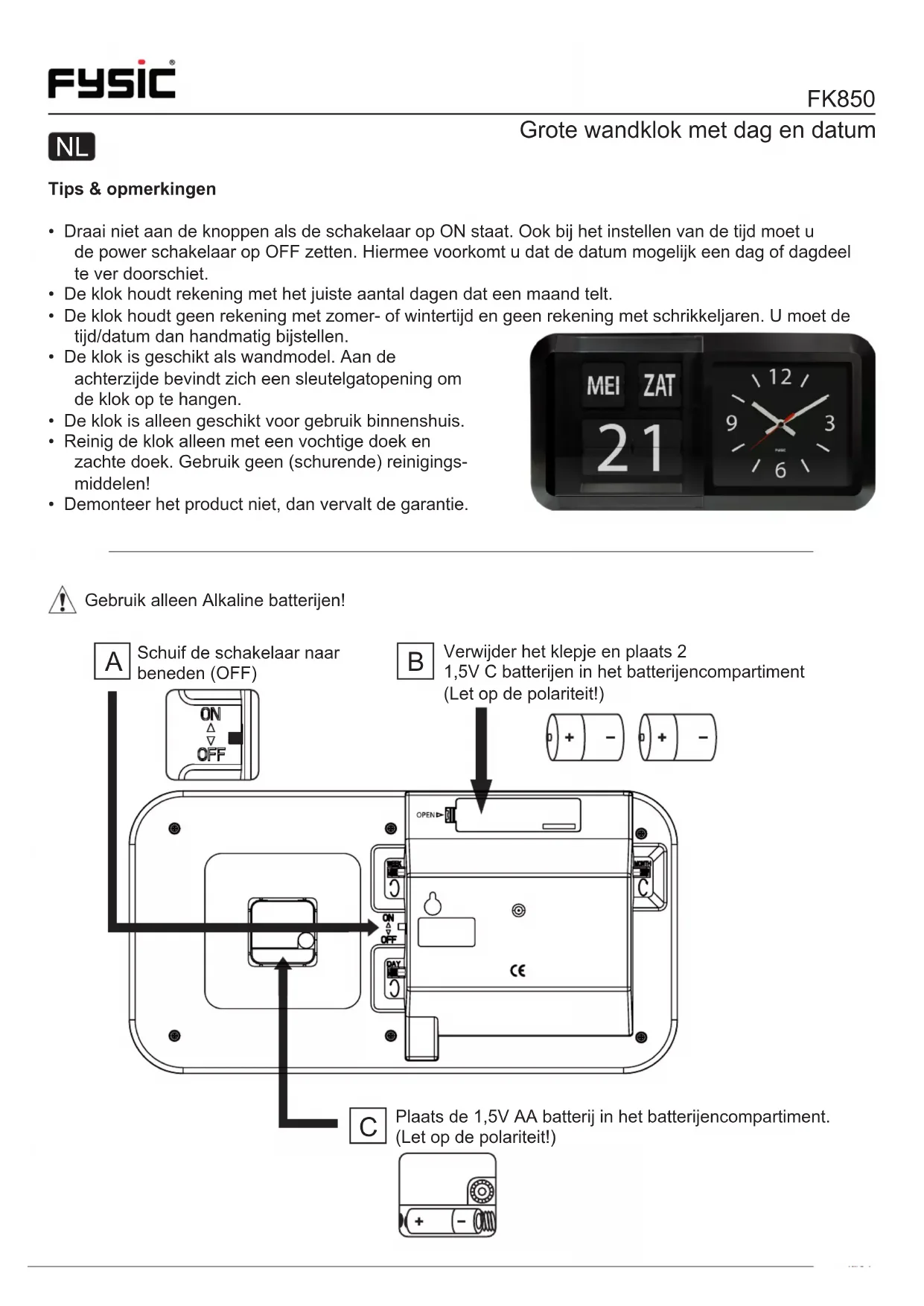MEI MEI DAG AVOND N’utilisez que des piles alcalines ! FREnn, positionnez le commutateur d’alimentation en haut sur « ON » pour allumer l’horloge FK850. www.fysic.com v1.0