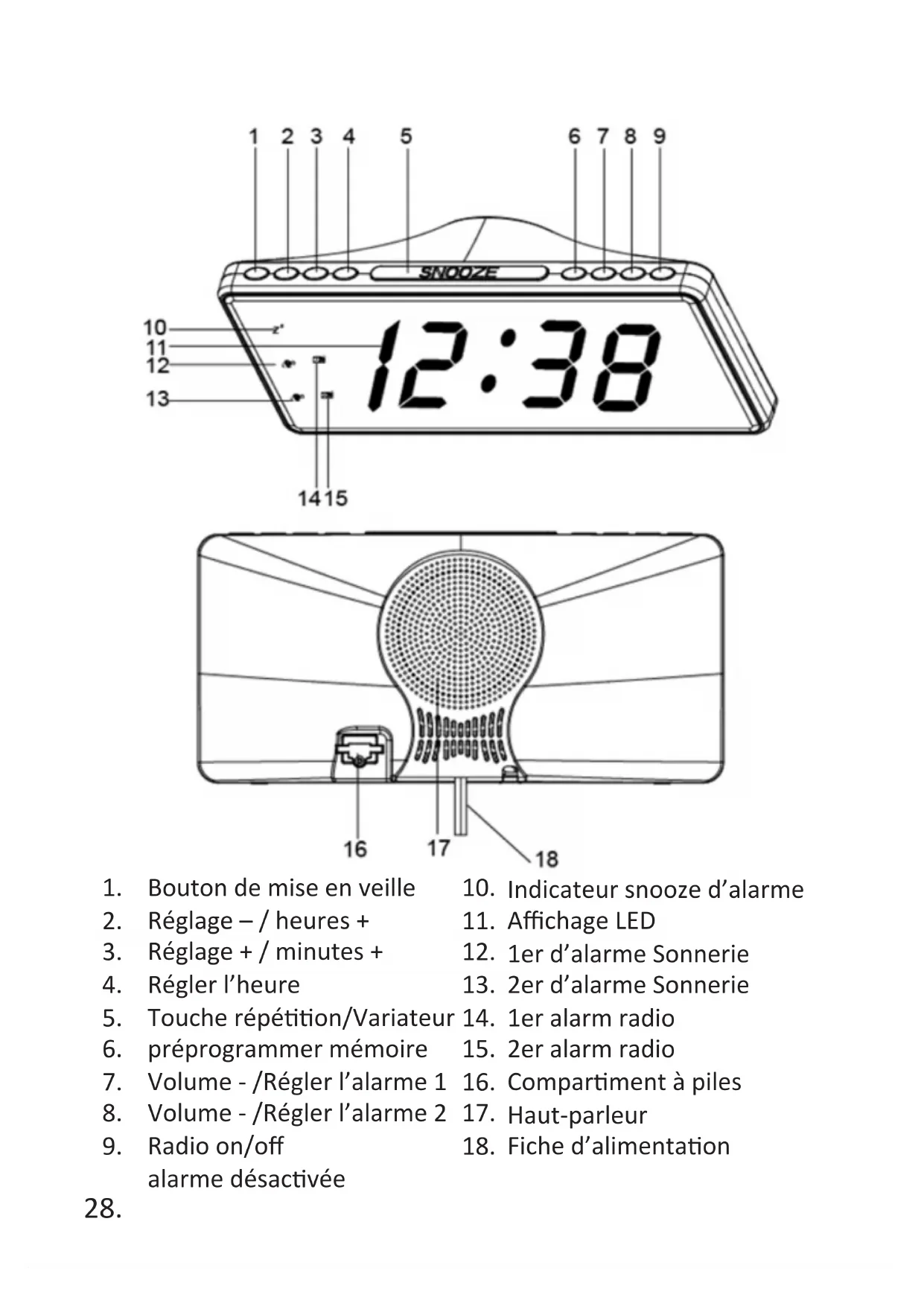Bouton de mise en veille Réglage – / heures + Réglage + / minutes + Régler l’heure Touche répéon/Variateur préprogrammer mémoire Volume - /Régler l’alarme 1 Volume - /Régler l’alarme 2 Radio on/o alarme désacvée Indicateur snooze d’alarme Achage LED 1er d’alarme Sonnerie 2er d’alarme Sonnerie 1er alarm radio 2er alarm radio Comparment à piles Haut-parleur Fiche d’alimentaon 28.Appuyez sur le bouton « ON/OFF » pour allumer ou éteindre le radio-réveil. Ajuster « TUNING + » ou « TUNING - » pour séleconner la staon désirée : appuyer brièvement TU + pour la recherche manuelle, appuyer longuement sur TU+ pour la recherche au- tomaque de la staon suivante. Ulisez les touches « VOL+ »/« VOL- » pour régler le volume.