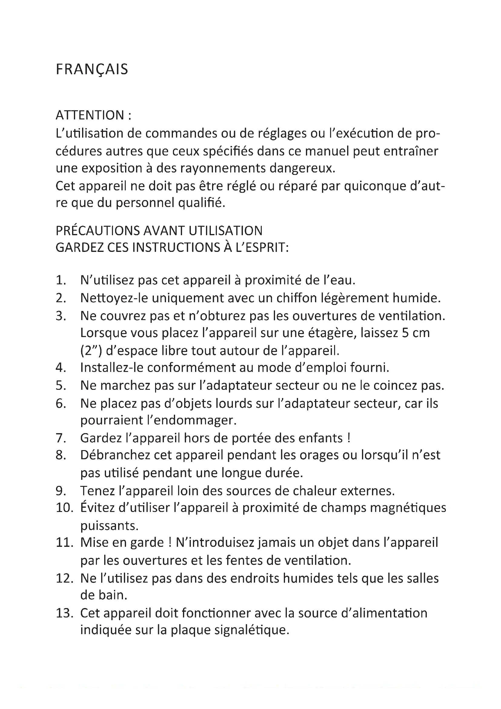 GARDEZ CES INSTRUCTIONS À L’ESPRIT: N’ulisez pas cet appareil à proximité de l’eau. Neoyez-le uniquement avec un chion légèrement humide. Ne couvrez pas et n’obturez pas les ouvertures de venlaon. Lorsque vous placez l’appareil sur une étagère, laissez 5 cm (2”) d’espace libre tout autour de l’appareil. Installez-le conformément au mode d’emploi fourni. Ne marchez pas sur l’adaptateur secteur ou ne le coincez pas. Ne placez pas d’objets lourds sur l’adaptateur secteur, car ils pourraient l’endommager. Gardez l’appareil hors de portée des enfants ! Débranchez cet appareil pendant les orages ou lorsqu’il n’est pas ulisé pendant une longue durée. Tenez l’appareil loin des sources de chaleur externes. Évitez d’uliser l’appareil à proximité de champs magnéques puissants. Mise en garde ! N’introduisez jamais un objet dans l’appareil par les ouvertures et les fentes de venlaon. Ne l’ulisez pas dans des endroits humides tels que les salles de bain. Cet appareil doit fonconner avec la source d’alimentaon indiquée sur la plaque signaléque.