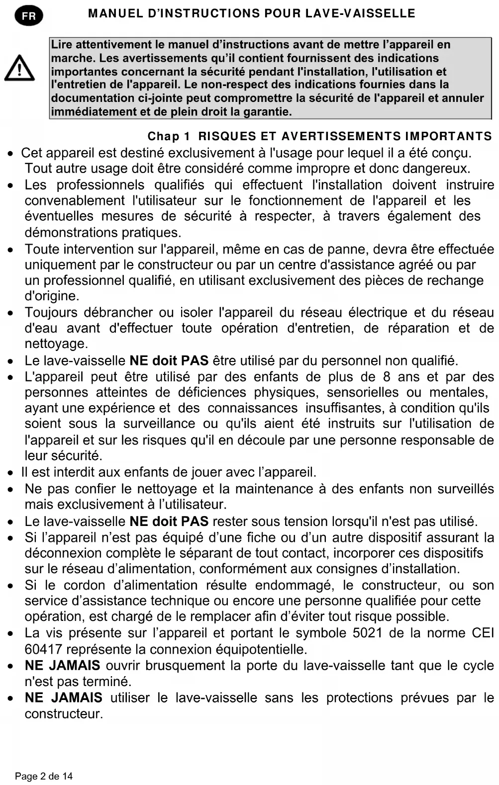 Cet appareil est destiné exclusivement à l'usage pour lequel il a été conçu. Tout autre usage doit être considéré comme impropre et donc dangereux. Les professionnels qualifiés qui effectuent l'installation doivent instruire convenablement l'utilisateur sur le fonctionnement de l'appareil et les éventuelles mesures de sécurité à respecter, à travers également des démonstrations pratiques. Toute intervention sur l'appareil, même en cas de panne, devra être effectuée uniquement par le constructeur ou par un centre d'assistance agréé ou par un professionnel qualifié, en utilisant exclusivement des pièces de rechange d'origine. Toujours débrancher ou isoler l'appareil du réseau électrique et du réseau d'eau avant d'effectuer toute opération d'entretien, de réparation et de nettoyage. Le lave-vaisselle NE doit PAS être utilisé par du personnel non qualifié. L'appareil peut être utilisé par des enfants de plus de 8 ans et par des personnes atteintes de déficiences physiques, sensorielles ou mentales, ayant une expérience et des connaissances insuffisantes, à condition qu'ils soient sous la surveillance ou qu'ils aient été instruits sur l'utilisation de l'appareil et sur les risques qu'il en découle par une personne responsable de leur sécurité. Il est interdit aux enfants de jouer avec l’appareil. Ne pas confier le nettoyage et la maintenance à des enfants non surveillés mais exclusivement à l’utilisateur. Le lave-vaisselle NE doit PAS rester sous tension lorsqu'il n'est pas utilisé. Si l’appareil n’est pas équipé d’une fiche ou d’un autre dispositif assurant la déconnexion complète le séparant de tout contact, incorporer ces dispositifs sur le réseau d’alimentation, conformément aux consignes d’installation. Si le cordon d’alimentation résulte endommagé, le constructeur, ou son service d’assistance technique ou encore une personne qualifiée pour cette opération, est chargé de le remplacer afin d’éviter tout risque possible. La vis présente sur l’appareil et portant le symbole 5021 de la norme CEI 60417 représente la connexion équipotentielle. NE JAMAIS ouvrir brusquement la porte du lave-vaisselle tant que le cycle n'est pas terminé. NE JAMAIS utiliser le lave-vaisselle sans les protections prévues par le constructeur.MANUEL D’INSTRUCTIONS POUR LAVE-VAISSELLE Page 3 de 14