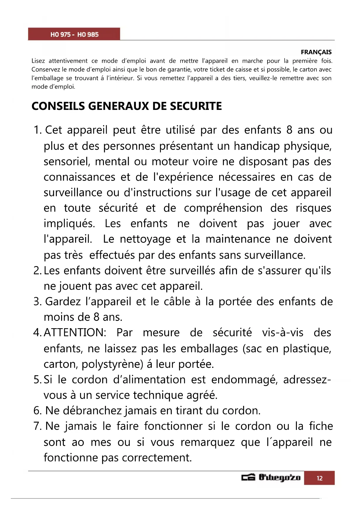 MODE D'EMPLOI HO 975 Orbegozo