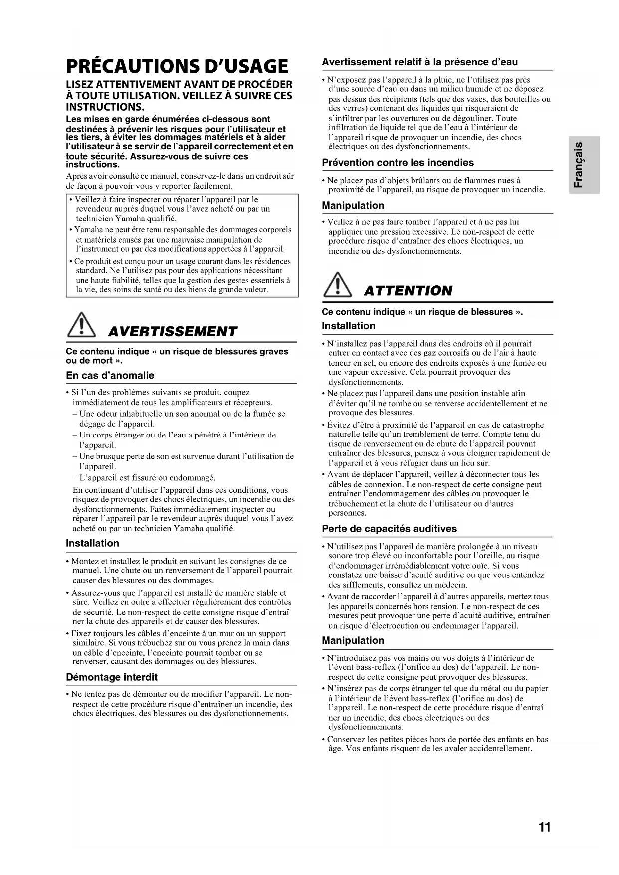 - Si l’un des problèmes suivants se produit, coupez immédiatement de tous les amplificateurs et récepteurs. – Une odeur inhabituelle un son anormal ou de la fumée se dégage de l’appareil. – Un corps étranger ou de l’eau a pénétré à l’intérieur de l’appareil. – Une brusque perte de son est survenue durant l’utilisation de l’appareil. – L’appareil est fissuré ou endommagé. En continuant d’utiliser l’appareil dans ces conditions, vous risquez de provoquer des chocs électriques, un incendie ou des dysfonctionnements. Faites immédiatement inspecter ou réparer l’appareil par le revendeur auprès duquel vous l’avez acheté ou par un technicien Yamaha qualifié. Installation