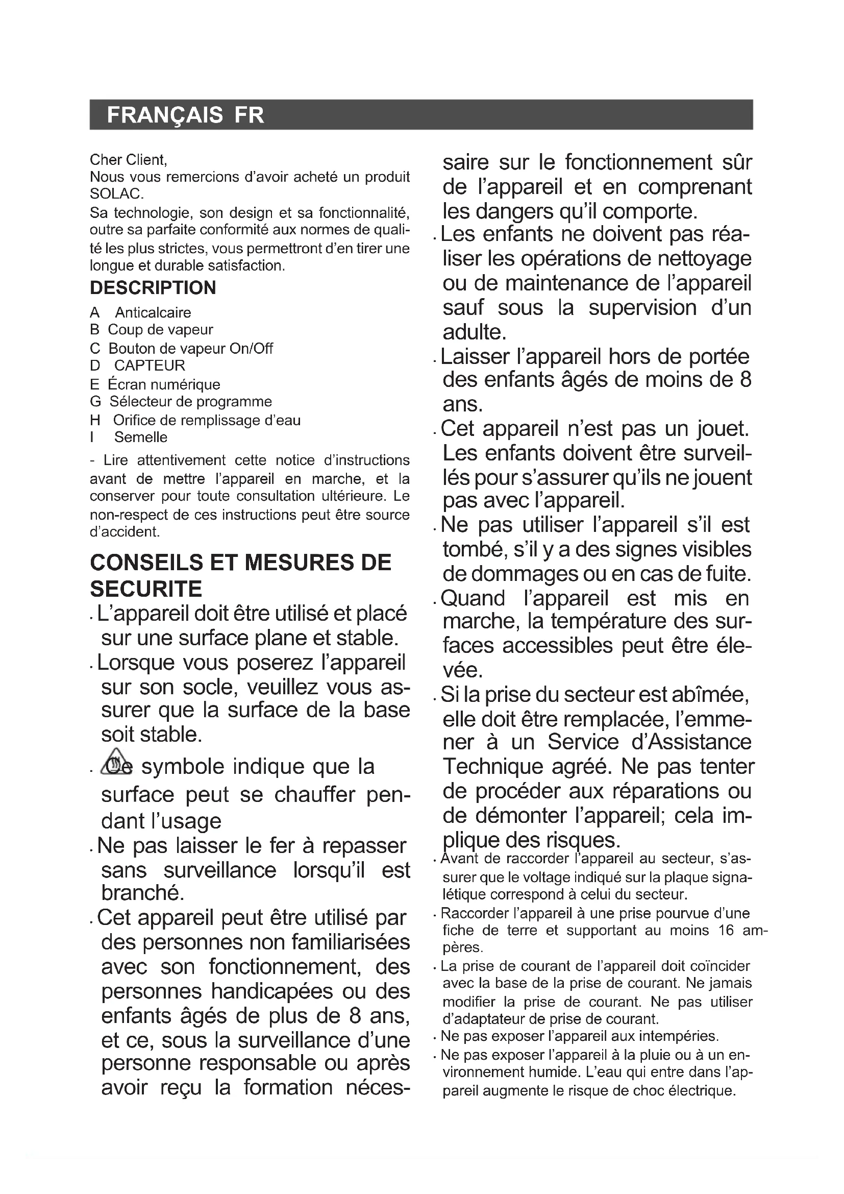 Cher Client, Nous vous remercions d’avoir acheté un produit SOLAC. Sa technologie, son design et sa fonctionnalité, outre sa parfaite conformité aux normes de quali- té les plus strictes, vous permettront d’en tirer une longue et durable satisfaction. DESCRIPTION A Anticalcaire B Coup de vapeur C Bouton de vapeur On/Off D CAPTEUR E Écran numérique G Sélecteur de programme H Orice de remplissage d’eau I Semelle - Lire attentivement cette notice d’instructions avant de mettre l’appareil en marche, et la conserver pour toute consultation ultérieure. Le non-respect de ces instructions peut être source d’accident.