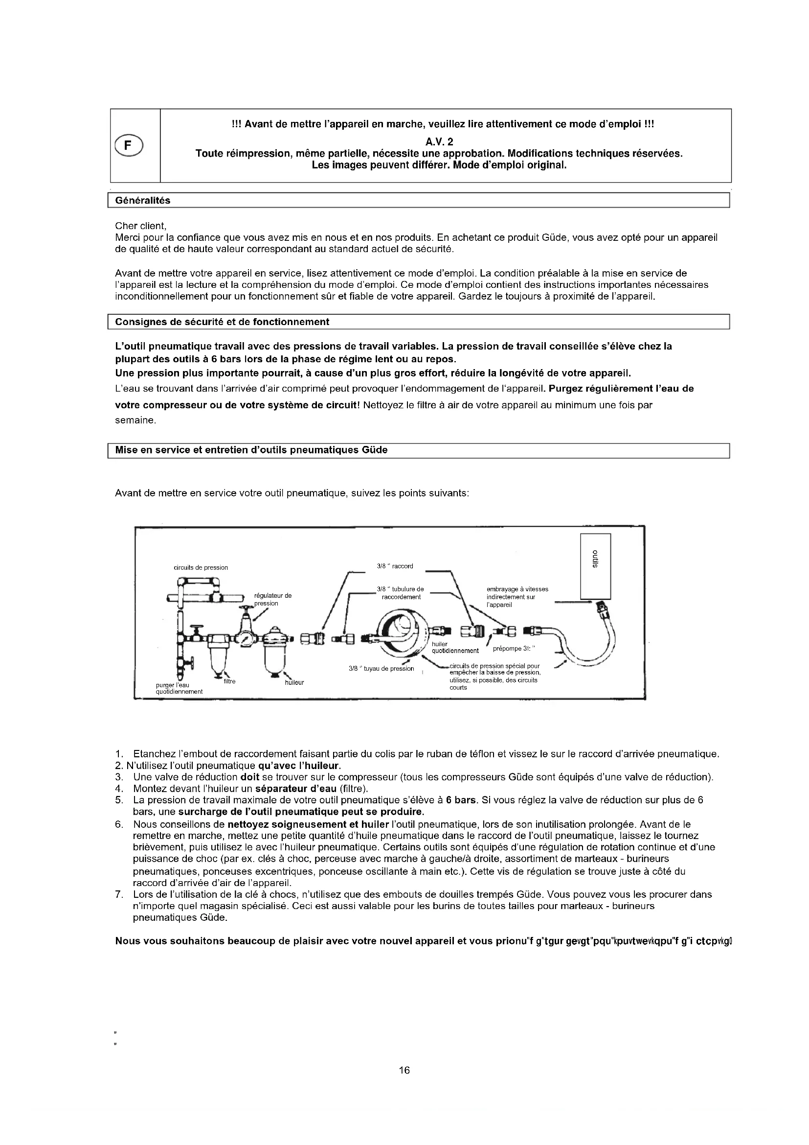 5. La pression de travail maximale de votre outil pneumatique s’élève à 6 bars. Si vous réglez la valve de réduction sur plus de 6 bars, une surcharge de l’outil pneumatique peut se produire. 6. Nous conseillons de nettoyez soigneusement et huiler l’outil pneumatique, lors de son inutilisation prolongée. Avant de le remettre en marche, mettez une petite quantité d’huile pneumatique dans le raccord de l’outil pneumatique, laissez le tournez brièvement, puis utilisez le avec l’huileur pneumatique. Certains outils sont équipés d’une régulation de rotation continue et d’une puissance de choc (par ex. clés à choc, perceuse avec marche à gauche/à droite, assortiment de marteaux - burineurs pneumatiques, ponceuses excentriques, ponceuse oscillante à main etc.). Cette vis de régulation se trouve juste à côté du raccord d’arrivée d’air de l’appareil. 7. Lors de l’utilisation de la clé à chocs, n’utilisez que des embouts de douilles trempés Güde. Vous pouvez vous les procurer dans n’importe quel magasin spécialisé. Ceci est aussi valable pour les burins de toutes tailles pour marteaux - burineurs pneumatiques Güde. Nous vous souhaitons beaucoup de plaisir avec votre nouvel appareil et vous prionVGHUHVSHFWHUQRVLQVWUXFWLRQVGHJDUDQWLH