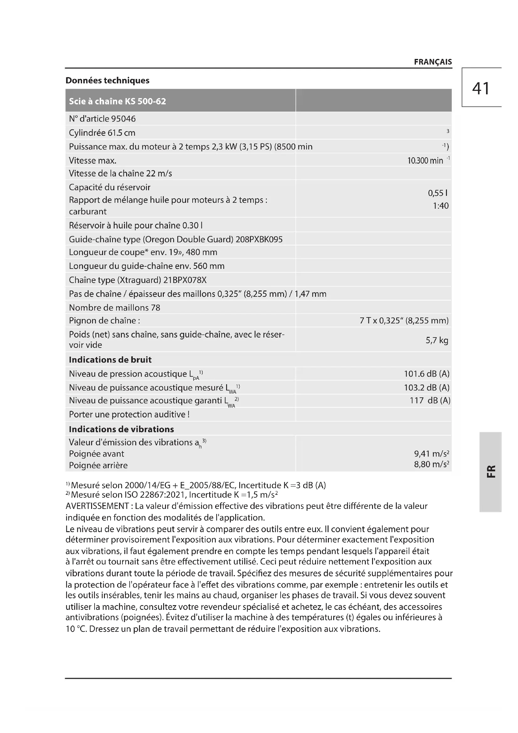 Données techniques Scie à chaîne KS 500-62 N° d'article 95046 Cylindrée 61.5 cm