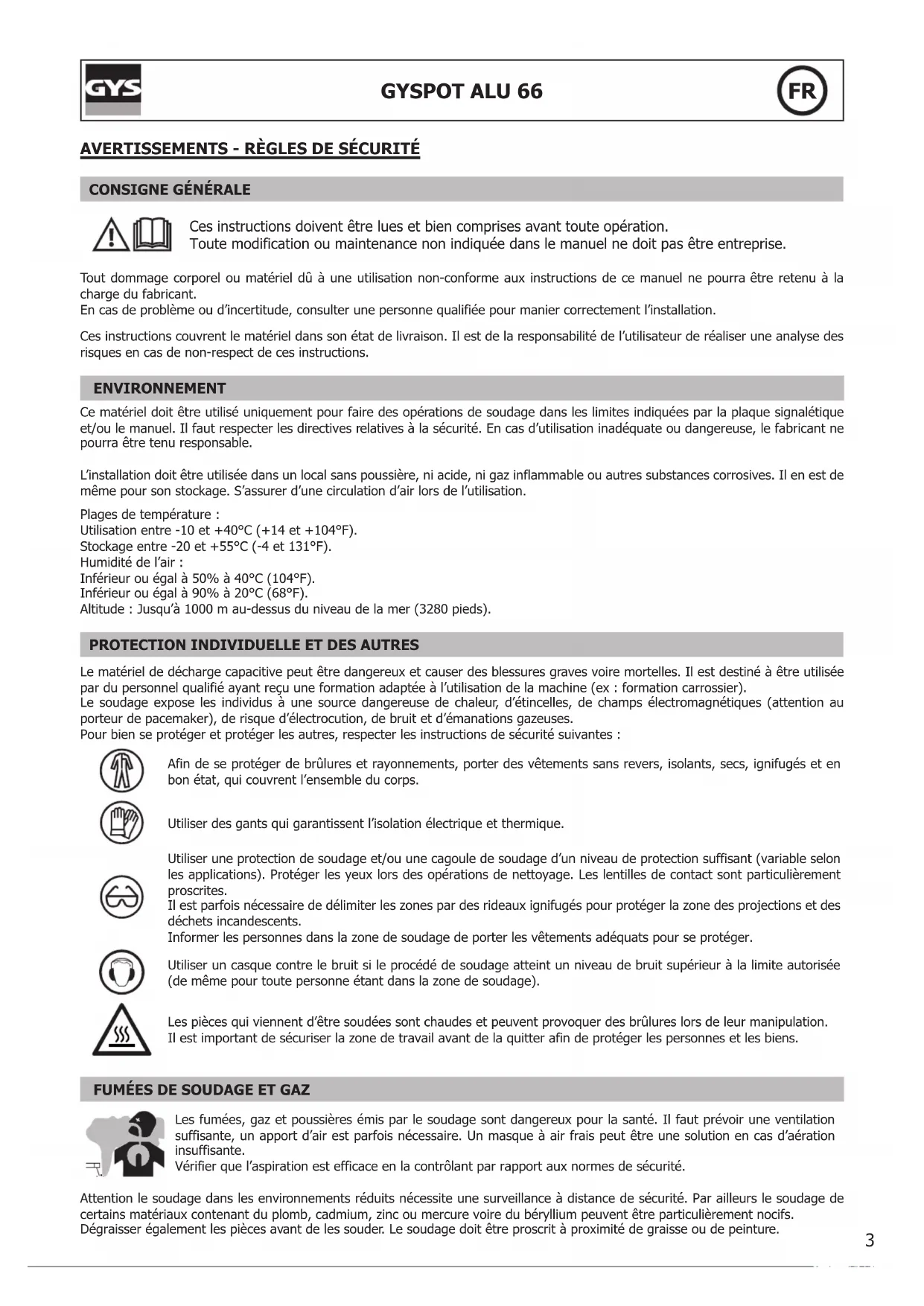 Les fumées, gaz et poussières émis par le soudage sont dangereux pour la santé. Il faut prévoir une ventilation suffisante, un apport d’air est parfois nécessaire. Un masque à air frais peut être une solution en cas d’aération insuffisante.Vérifier que l’aspiration est efficace en la contrôlant par rapport aux normes de sécurité. Attention le soudage dans les environnements réduits nécessite une surveillance à distance de sécurité. Par ailleurs le soudage de certains matériaux contenant du plomb, cadmium, zinc ou mercure voire du béryllium peuvent être particulièrement nocifs. Dégraisser également les pièces avant de les souder. Le soudage doit être proscrit à proximité de graisse ou de peinture.4 GYSPOT ALU 66