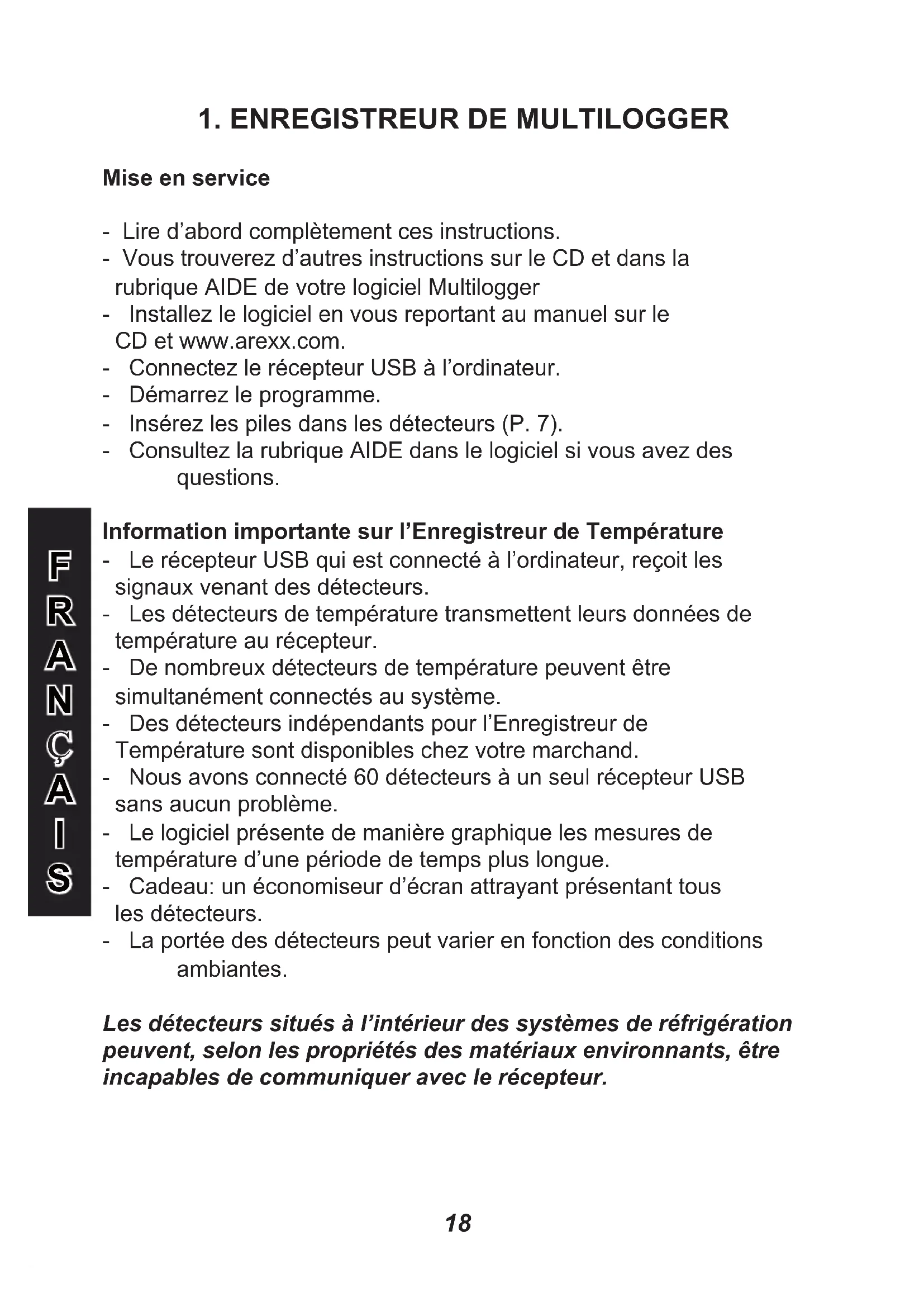 Mise en service - Lire d’abord complètement ces instructions. - Vous trouverez d’autres instructions sur le CD et dans la rubrique AIDE de votre logiciel Multilogger - Installez le logiciel en vous reportant au manuel sur le CD et www.arexx.com. - Connectez le récepteur USB à l’ordinateur. - Démarrez le programme. - Insérez les piles dans les détecteurs (P. 7). - Consultez la rubrique AIDE dans le logiciel si vous avez des questions. Information importante sur l’Enregistreur de Température - Le récepteur USB qui est connecté à l’ordinateur, reçoit les signaux venant des détecteurs. - Les détecteurs de température transmettent leurs données de température au récepteur. - De nombreux détecteurs de température peuvent être simultanément connectés au système. - Des détecteurs indépendants pour l’Enregistreur de Température sont disponibles chez votre marchand. - Nous avons connecté 60 détecteurs à un seul récepteur USB sans aucun problème. - Le logiciel présente de manière graphique les mesures de température d’une période de temps plus longue. - Cadeau: un économiseur d’écran attrayant présentant tous les détecteurs. - La portée des détecteurs peut varier en fonction des conditions ambiantes. Les détecteurs situés à l’intérieur des systèmes de réfrigération peuvent, selon les propriétés des matériaux environnants, être incapables de communiquer avec le récepteur.