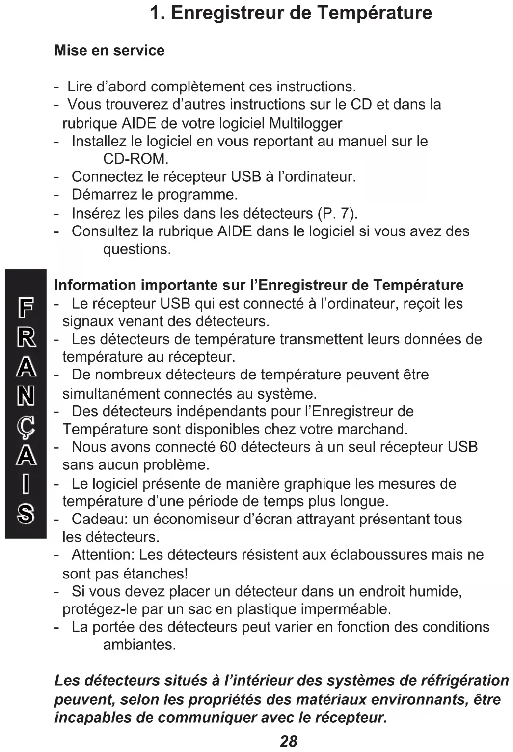 Mise en service - Lire d’abord complètement ces instructions. - Vous trouverez d’autres instructions sur le CD et dans la rubrique AIDE de votre logiciel Multilogger - Installez le logiciel en vous reportant au manuel sur le CD-ROM. - Connectez le récepteur USB à l’ordinateur. - Démarrez le programme. - Insérez les piles dans les détecteurs (P. 7). - Consultez la rubrique AIDE dans le logiciel si vous avez des questions. Information importante sur l’Enregistreur de Température - Le récepteur USB qui est connecté à l’ordinateur, reçoit les signaux venant des détecteurs. - Les détecteurs de température transmettent leurs données de température au récepteur. - De nombreux détecteurs de température peuvent être simultanément connectés au système. - Des détecteurs indépendants pour l’Enregistreur de Température sont disponibles chez votre marchand. - Nous avons connecté 60 détecteurs à un seul récepteur USB sans aucun problème. - Le logiciel présente de manière graphique les mesures de température d’une période de temps plus longue. - Cadeau: un économiseur d’écran attrayant présentant tous les détecteurs. - Attention: Les détecteurs résistent aux éclaboussures mais ne sont pas étanches! - Si vous devez placer un détecteur dans un endroit humide, protégez-le par un sac en plastique imperméable. - La portée des détecteurs peut varier en fonction des conditions ambiantes. Les détecteurs situés à l’intérieur des systèmes de réfrigération peuvent, selon les propriétés des matériaux environnants, être incapables de communiquer avec le récepteur.