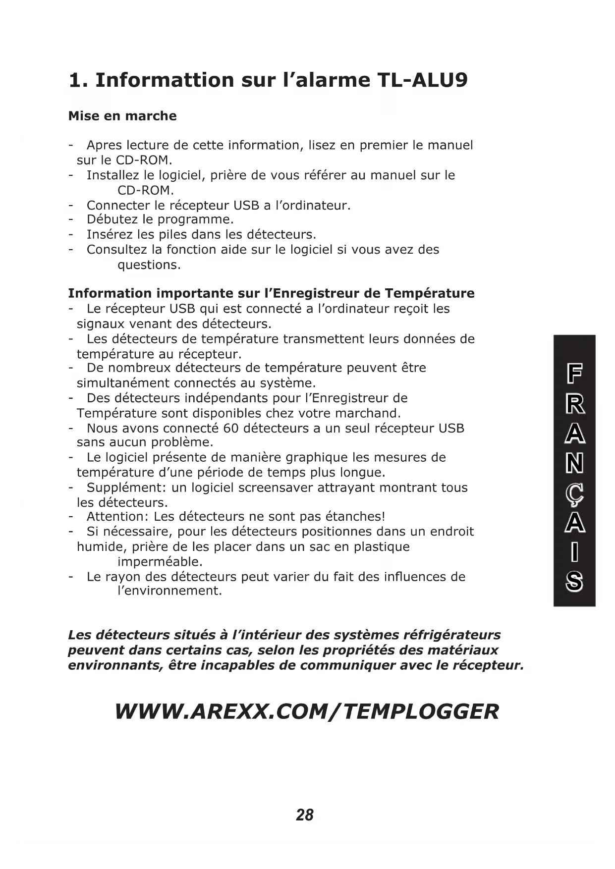 Mise en marche - Apres lecture de cette information, lisez en premier le manuel sur le CD-ROM. - Installez le logiciel, prière de vous référer au manuel sur le CD-ROM. - Connecter le récepteur USB a l’ordinateur. - Débutez le programme. - Insérez les piles dans les détecteurs. - Consultez la fonction aide sur le logiciel si vous avez des questions. Information importante sur l’Enregistreur de Température - Le récepteur USB qui est connecté a l’ordinateur reçoit les signaux venant des détecteurs. - Les détecteurs de température transmettent leurs données de température au récepteur. - De nombreux détecteurs de température peuvent être simultanément connectés au système. - Des détecteurs indépendants pour l’Enregistreur de Température sont disponibles chez votre marchand. - Nous avons connecté 60 détecteurs a un seul récepteur USB sans aucun problème. - Le logiciel présente de manière graphique les mesures de température d’une période de temps plus longue. - Supplément: un logiciel screensaver attrayant montrant tous les détecteurs. - Attention: Les détecteurs ne sont pas étanches! - Si nécessaire, pour les détecteurs positionnes dans un endroit humide, prière de les placer dans un sac en plastique imperméable. - Le rayon des détecteurs peut varier du fait des inuences de l’environnement. Les détecteurs situés à l’intérieur des systèmes réfrigérateurs peuvent dans certains cas, selon les propriétés des matériaux environnants, être incapables de communiquer avec le récepteur.