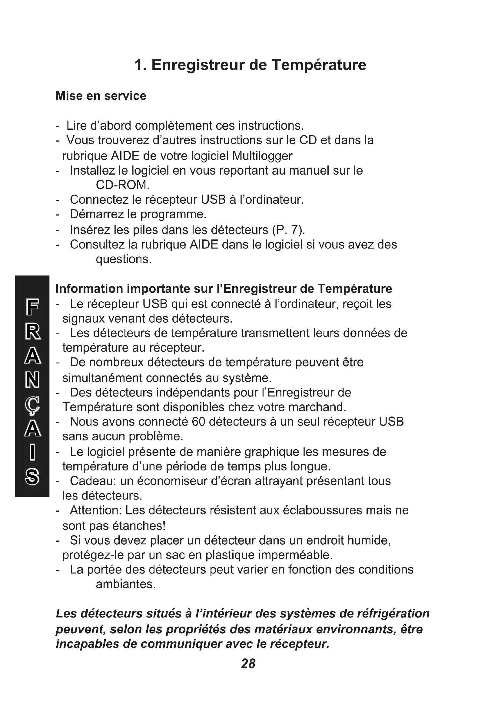 Mise en service - Lire d’abord complètement ces instructions. - Vous trouverez d’autres instructions sur le CD et dans la rubrique AIDE de votre logiciel Multilogger - Installez le logiciel en vous reportant au manuel sur le CD-ROM. - Connectez le récepteur USB à l’ordinateur. - Démarrez le programme. - Insérez les piles dans les détecteurs (P. 7). - Consultez la rubrique AIDE dans le logiciel si vous avez des questions. Information importante sur l’Enregistreur de Température - Le récepteur USB qui est connecté à l’ordinateur, reçoit les signaux venant des détecteurs. - Les détecteurs de température transmettent leurs données de température au récepteur. - De nombreux détecteurs de température peuvent être simultanément connectés au système. - Des détecteurs indépendants pour l’Enregistreur de Température sont disponibles chez votre marchand. - Nous avons connecté 60 détecteurs à un seul récepteur USB sans aucun problème. - Le logiciel présente de manière graphique les mesures de température d’une période de temps plus longue. - Cadeau: un économiseur d’écran attrayant présentant tous les détecteurs. - Attention: Les détecteurs résistent aux éclaboussures mais ne sont pas étanches! - Si vous devez placer un détecteur dans un endroit humide, protégez-le par un sac en plastique imperméable. - La portée des détecteurs peut varier en fonction des conditions ambiantes. Les détecteurs situés à l’intérieur des systèmes de réfrigération peuvent, selon les propriétés des matériaux environnants, être incapables de communiquer avec le récepteur.