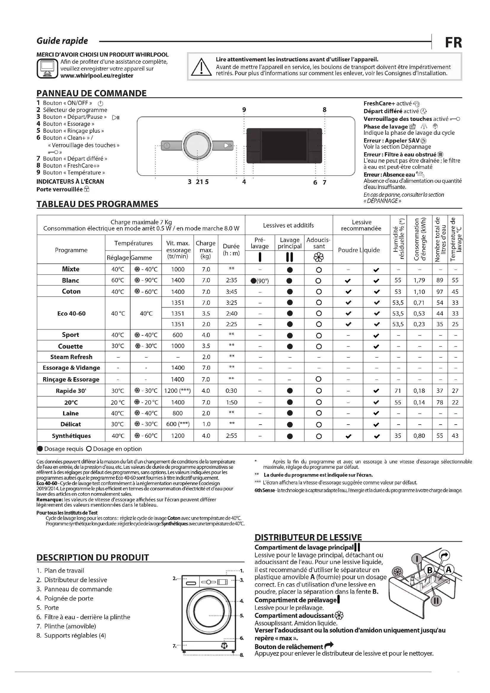 Guide rapide MERCI D’AVOIR CHOISI UN PRODUIT WHIRLPOOLAn de proter d’une assistance complète, veuillez enregistrer votre appareil sur www . whirlpool . eu/ registerLire attentivement les instructions avant d’utiliser l’appareil.Avant de mettre l’appareil en service, les boulons de transport doivent être impérativement retirés. Pour plus d’informations sur comment les enlever, voir les Consignes d’installation.