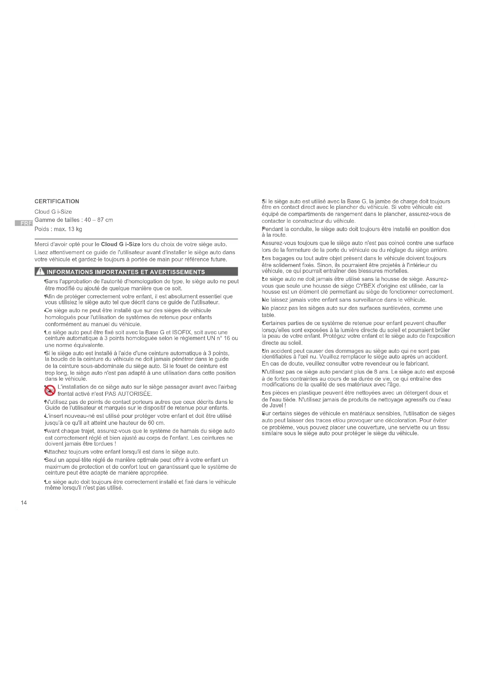CERTIFICATION Cloud G i-Size Gamme de tailles : 40 – 87 cm Poids : max. 13 kg Merci d'avoir opté pour le Cloud G i-Size lors du choix de votre siège auto. Lisez attentivement ce guide de l'utilisateur avant d'installer le siège auto dans votre véhicule et gardez-le toujours à portée de main pour référence future.