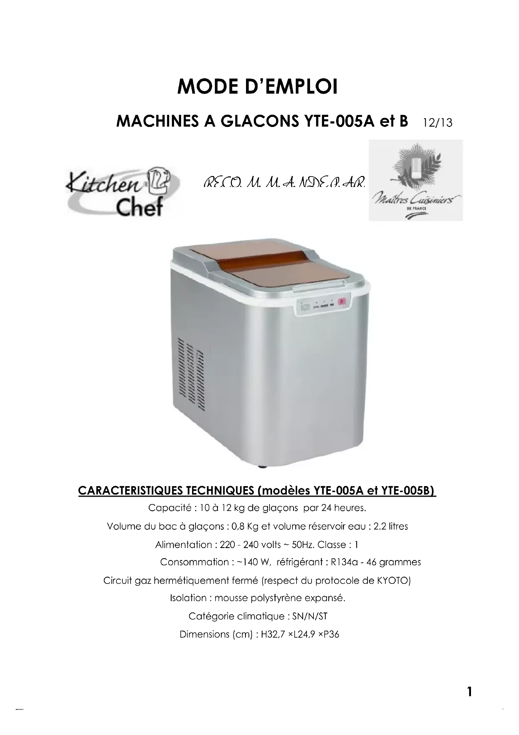 CARACTERISTIQUES TECHNIQUES (modèles YTE-005A et YTE-005B) Capacité : 10 à 12 kg de glaçons par 24 heures. Volume du bac à glaçons : 0,8 Kg et volume réservoir eau : 2.2 litres Alimentation : 220 - 240 volts ~ 50Hz. Classe : 1 Consommation : ~140 W, réfrigérant : R134a - 46 grammes Circuit gaz hermétiquement fermé (respect du protocole de KYOTO) Isolation : mousse polystyrène expansé. Catégorie climatique : SN/N/ST Dimensions (cm) : H32,7 ×L24,9 ×P36 Ce symbole, figurant sur l’étiquette signalétique signifie que cet article, lorsqu’il est usagé, fait l’objet d’une collecte sélective,(pour les modalités de cette collecte, se renseigner auprès de votre commune) où d’une reprise à titre gratuit par le distributeur pour l’acquisition d’un article similaire (port a vos frais). Compte tenu des effets sur l’environnement et la santé humaine, en raison de la présence de substances dangereuses dans les équipements électriques et électroniques, CET ARTICLE NE DOIT PAS ETRE JETE AVEC LES DECHETS MUNICIPAUX NON TRIES
