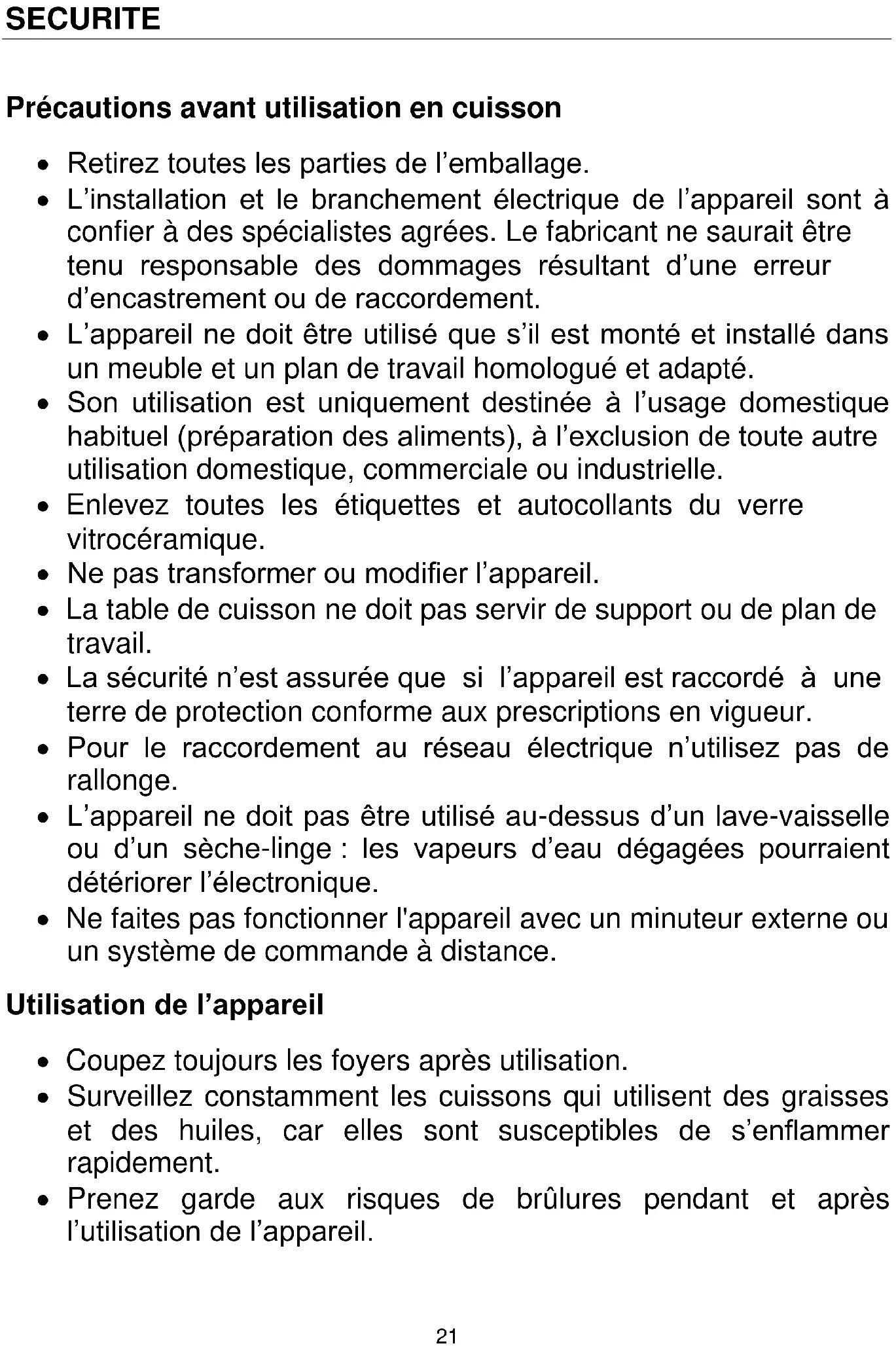 INSTRUCTIONS D’INSTALLATION ........................................................................................... 35 CONNEXION ELECTRIQUE ....................................................................................................... 3621 SECURITE Précautions avant utilisation en cuisson Retirez toutes les parties de l’emballage. L’installation et le branchement électrique de l’appareil sont à confier à des spécialistes agrées. Le fabricant ne saurait être tenu responsable des dommages résultant d’une erreur d’encastrement ou de raccordement. L’appareil ne doit être utilisé que s’il est monté et installé dans un meuble et un plan de travail homologué et adapté. Son utilisation est uniquement destinée à l’usage domestique habituel (préparation des aliments), à l’exclusion de toute autre utilisation domestique, commerciale ou industrielle. Enlevez toutes les étiquettes et autocollants du verre vitrocéramique. Ne pas transformer ou modifier l’appareil. La table de cuisson ne doit pas servir de support ou de plan de travail. La sécurité n’est assurée que si l’appareil est raccordé à une terre de protection conforme aux prescriptions en vigueur. Pour le raccordement au réseau électrique n’utilisez pas de rallonge. L’appareil ne doit pas être utilisé au-dessus d’un lave-vaisselle ou d’un sèche-linge : les vapeurs d’eau dégagées pourraient détériorer l’électronique. Ne faites pas fonctionner l'appareil avec un minuteur externe ou un système de commande à distance. Utilisation de l’appareil Coupez toujours les foyers après utilisation. Surveillez constamment les cuissons qui utilisent des graisses et des huiles, car elles sont susceptibles de s’enflammer rapidement. Prenez garde aux risques de brûlures pendant et après l’utilisation de l’appareil.22 Assurez-vous qu’aucun câble électrique d’appareil fixe ou mobile ne vienne en contact avec la vitre ou la casserole chaude. Les objets magnétisables (cartes de crédits, disquettes informatiques, calculatrices) ne doivent pas se trouver à proximité immédiate de l’appareil en fonction. Ne placez aucun objet métallique autre que les récipients de chauffe. En cas d’enclenchement intempestif ou de chaleur résiduelle, celui-ci risquerait selon le matériau de chauffer, de fondre ou de commencer à brûler. Ne jamais couvrir l’appareil d’un chiffon ou d’une feuille de protection. Il pourrait devenir très chaud et prendre feu. Cet appareil peut être utilisé par des enfants âgés de 8 ans et plus et des personnes dont les capacités physiques, sensorielles ou mentales sont réduites ou dont les expériences et les connaissances sont inadaptées, uniquement si elles sont surveillées, formées à l’utilisation de l’appareil en conditions de sécurité et informées des risques susceptibles de se présenter. Les enfants ne doivent pas jouer avec l’appareil. Le nettoyage et l’entretien ne doivent pas être confiés à des enfants sans surveillance d’adultes. Les objets métalliques tels que des couteaux, des fourchettes, des cuillères et des couvercles ne devraient pas être placés la surface vitrée puisqu'ils peuvent devenir chauds.23 Précautions pour ne pas détériorer l’appareil Les casseroles à semelles brutes (fonte non émaillée,…) ou abîmées peuvent endommager la vitrocéramique. La présence de sable ou d’autres matériaux abrasifs peut endommager la vitrocéramique. Evitez de faire chuter des objets, mêmes petits, sur la vitrocéramique. Ne heurtez pas les bords de la vitre avec les casseroles. S’assurer que la ventilation de l’appareil se fasse suivant les instructions du constructeur. Ne posez pas ou ne pas laisser de casseroles vides sur la table de cuisson. Eviter que le sucre, les matières synthétiques ou une feuille d’aluminium ne touchent les zones chaudes. Ces substances peuvent au refroidissement provoquer des cassures ou d’autres modifications de la surface vitrocéramique: Eteindre l’appareil et enlevez-les immédiatement de la zone de cuisson encore chaude (attention : risque de brûlures). MISE EN GARDE: Risque d’incendie : ne pas entreposer d’objets sur la surface de cuisson. Ne placez jamais de récipients chauds au-dessus de la zone de commande. Si un tiroir est situé sous l’appareil encastré, assurer un écart suffisant (2 cm) entre le contenu de ce tiroir et la partie inférieure de l’appareil afin d’assurer une bonne ventilation. Ne déposez pas d’objets inflammables (ex. sprays) dans le tiroir placé sous la table de cuisson. Les éventuels casiers à couverts doivent être en matériau résistant à la chaleur.24 Précautions en cas de défaillance de l’appareil Si un défaut est constaté, il faut débrancher l’appareil et couper l’alimentation électrique. En cas de fêlure ou de fissure de la vitrocéramique il faut impérativement débrancher l’appareil du réseau électrique et prévenir le service après-vente. Les réparations doivent être entreprises exclusivement par un personnel spécialisé. N’ouvrez en aucun cas l’appareil vous- même. ATTENTION : Si la surface vitrée est fissurée, coupez l’alimentation de l’appareil pour éviter une éventuelle décharge électrique. Autres protections Assurez-vous que le récipient de cuisson soit toujours centré sur la zone de cuisson. Le fond de la casserole doit autant que possible couvrir la zone de cuisson. Pour les utilisateurs portant un régulateur de rythme cardiaque, le champ magnétique pourrait influencer son fonctionnement. Nous recommandons de se renseigner auprès du revendeur ou du médecin. N’utilisez pas de récipients en matière synthétique ou en aluminium : ils pourraient fondre sur des foyers encore chauds. NE JAMAIS essayer d’éteindre un incendie avec de l’eau, mais arrêter l’appareil puis couvrir les flammes par exemple avec un couvercle ou une couverture