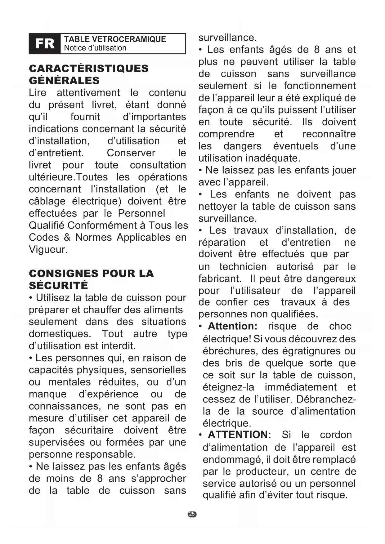 - Attention: risque de choc électrique! Si vous découvrez des ébréchures, des égratignures ou des bris de quelque sorte que ce soit sur la table de cuisson, éteignez-la immédiatement et cessez de l’utiliser. Débranchez- la de la source d’alimentation électrique.