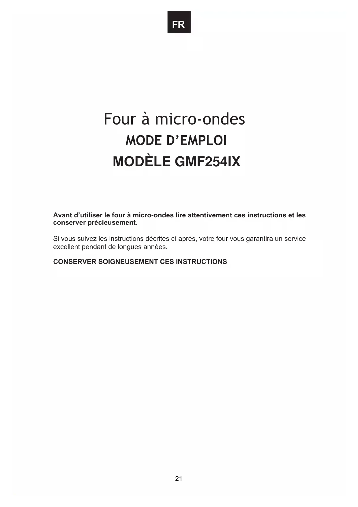 Avant d’utiliser le four à micro-ondes lire attentivement ces instructions et les conserver précieusement. Si vous suivez les instructions décrites ci-après, votre four vous garantira un service excellent pendant de longues années.CONSERVER SOIGNEUSEMENT CES INSTRUCTIONS F R
