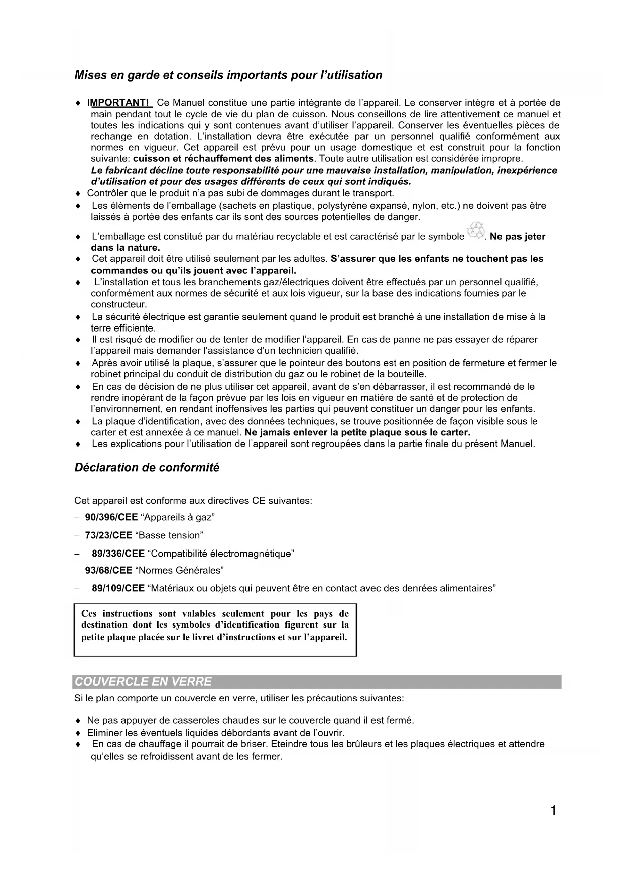 GT32GWH GT32GIXMises en garde et conseils importants pour l’utilisation i IMPORTANT! Ce Manuel constitue une partie intégrante de l’appareil. Le conserver intègre et à portée de main pendant tout le cycle de vie du plan de cuisson. Nous conseillons de lire attentivement ce manuel et toutes les indications qui y sont contenues avant d’utiliser l’appareil. Conserver les éventuelles pièces de rechange en dotation. L’installation devra être exécutée par un personnel qualifié conformément aux normes en vigueur. Cet appareil est prévu pour un usage domestique et est construit pour la fonction suivante: cuisson et réchauffement des aliments. Toute autre utilisation est considérée impropre. Le fabricant décline toute responsabilité pour une mauvaise installation, manipulation, inexpérience d’utilisation et pour des usages différents de ceux qui sont indiqués. i Contrôler que le produit n’a pas subi de dommages durant le transport. i Les éléments de l’emballage (sachets en plastique, polystyrène expansé, nylon, etc.) ne doivent pas être laissés à portée des enfants car ils sont des sources potentielles de danger. i L’emballage est constitué par du matériau recyclable et est caractérisé par le symbole . Ne pas jeter dans la nature. i Cet appareil doit être utilisé seulement par les adultes. S’assurer que les enfants ne touchent pas les commandes ou qu’ils jouent avec l’appareil. i L’installation et tous les branchements gaz/électriques doivent être effectués par un personnel qualifié, conformément aux normes de sécurité et aux lois vigueur, sur la base des indications fournies par le constructeur. i La sécurité électrique est garantie seulement quand le produit est branché à une installation de mise à la terre efficiente. i Il est risqué de modifier ou de tenter de modifier l’appareil. En cas de panne ne pas essayer de réparer l’appareil mais demander l’assistance d’un technicien qualifié. i Après avoir utilisé la plaque, s’assurer que le pointeur des boutons est en position de fermeture et fermer le robinet principal du conduit de distribution du gaz ou le robinet de la bouteille. i En cas de décision de ne plus utiliser cet appareil, avant de s’en débarrasser, il est recommandé de le rendre inopérant de la façon prévue par les lois en vigueur en matière de santé et de protection de l’environnement, en rendant inoffensives les parties qui peuvent constituer un danger pour les enfants. i La plaque d’identification, avec des données techniques, se trouve positionnée de façon visible sous le carter et est annexée à ce manuel. Ne jamais enlever la petite plaque sous le carter. i Les explications pour l’utilisation de l’appareil sont regroupées dans la partie finale du présent Manuel. Déclaration de conformité Cet appareil est conforme aux directives CE suivantes: 90/396/CEE “Appareils à gaz” 73/23/CEE “Basse tension” 89/336/CEE “Compatibilité électromagnétique” 93/68/CEE “Normes Générales” 89/109/CEE “Matériaux ou objets qui peuvent être en contact avec des denrées alimentaires”