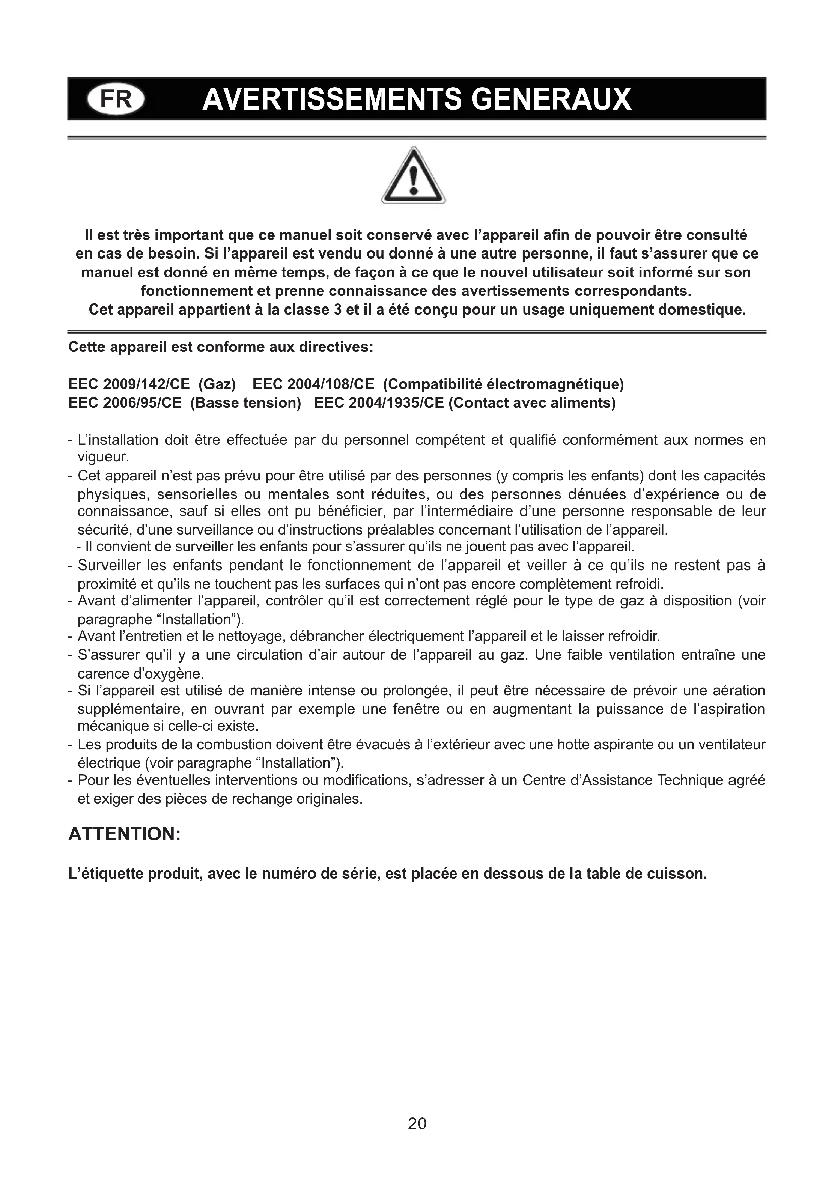 G20 20 - 476 71 / 116 Reg. 5000 210020 Il est très important que ce manuel soit conservé avec l’appareil afin de pouvoir être consulté en cas de besoin. Si l’appareil est vendu ou donné à une autre personne, il faut s’assurer que ce manuel est donné en même temps, de façon à ce que le nouvel utilisateur soit informé sur son fonctionnement et prenne connaissance des avertissements correspondants. Cet appareil appartient à la classe 3 et il a été conçu pour un usage uniquement domestique. Cette appareil est conforme aux directives: EEC 2009/142/CE (Gaz) EEC 2004/108/CE (Compatibilité électromagnétique) EEC 2006/95/CE (Basse tension) EEC 2004/1935/CE (Contact avec aliments) - L’installation doit être effectuée par du personnel compétent et qualifié conformément aux normes en vigueur. - Cet appareil n’est pas prévu pour être utilisé par des personnes (y compris les enfants) dont les capacités physiques, sensorielles ou mentales sont réduites, ou des personnes dénuées d’expérience ou de connaissance, sauf si elles ont pu bénéficier, par l’intermédiaire d’une personne responsable de leur sécurité, d’une surveillance ou d’instructions préalables concernant l’utilisation de l’appareil. - Il convient de surveiller les enfants pour s’assurer qu’ils ne jouent pas avec l’appareil. - Surveiller les enfants pendant le fonctionnement de l’appareil et veiller à ce qu’ils ne restent pas à proximité et qu’ils ne touchent pas les surfaces qui n’ont pas encore complètement refroidi. - Avant d’alimenter l’appareil, contrôler qu’il est correctement réglé pour le type de gaz à disposition (voir paragraphe “Installation”). - Avant l’entretien et le nettoyage, débrancher électriquement l’appareil et le laisser refroidir. - S’assurer qu’il y a une circulation d’air autour de l’appareil au gaz. Une faible ventilation entraîne une carence d’oxygène. - Si l’appareil est utilisé de manière intense ou prolongée, il peut être nécessaire de prévoir une aération supplémentaire, en ouvrant par exemple une fenêtre ou en augmentant la puissance de l’aspiration mécanique si celle-ci existe. - Les produits de la combustion doivent être évacués à l’extérieur avec une hotte aspirante ou un ventilateur électrique (voir paragraphe “Installation”). - Pour les éventuelles interventions ou modifications, s’adresser à un Centre d’Assistance Technique agréé et exiger des pièces de rechange originales. ATTENTION: L’étiquette produit, avec le numéro de série, est placée en dessous de la table de cuisson.