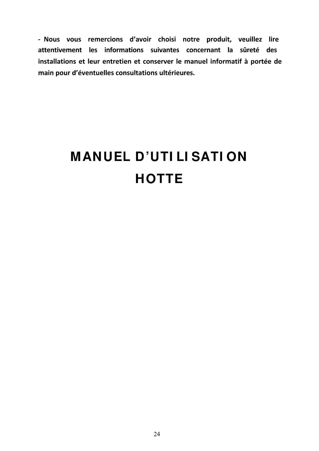 - Veuillez lire le présent manuel d’utilisation avant d’installer et d’utiliser la hotte. Et veuillez garder le manuel d’utilisation en sécurité pour consultation ultérieure.