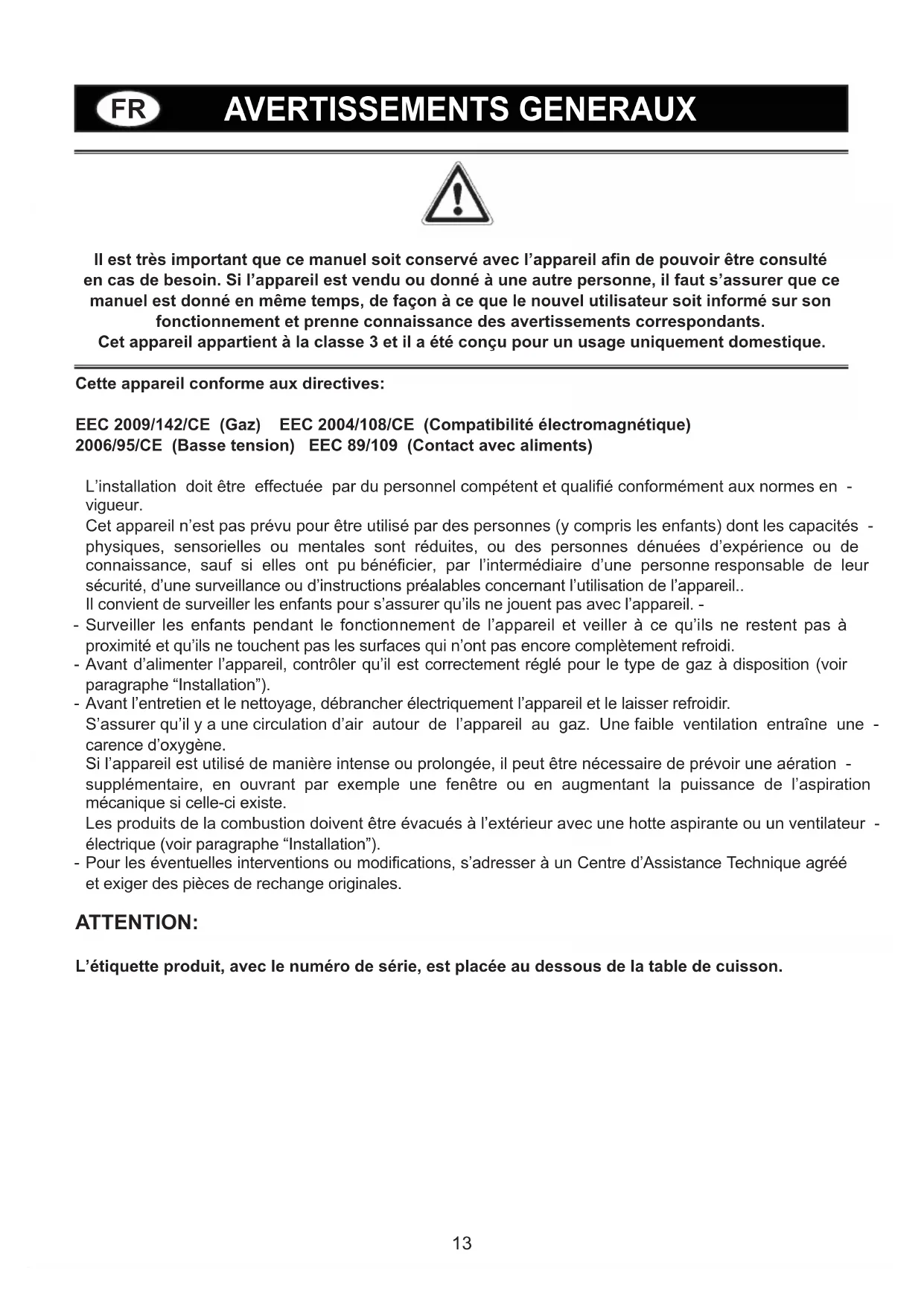 NETTOYAGE Avant toute opération de nettoyage, débrancher l’appareil du réseau d’alimentation électrique. N'utilisez jamais d'appareils à vapeur ou à haute pression pour nettoyer le four (exigences relatives à la sécurité électrique). Il est conseillé d’opérer quand l’appareil est froid. Plan en verre et parties émaillées Le plan en verre et les parties émaillées doivent être nettoyés avec une éponge et de l’eau savonneuse ou avec un détergent léger. Ne pas utiliser de produits abrasifs ou corrosifs. Eviter que les substances comme le jus de citron, la tomate, l’eau salée, le vinaigre, le café et le lait restent pendant longtemps sur les surfaces émaillées. Brûleurs et grilles Ces parties peuvent être enlevées pour faciliter le nettoyage. Les brûleurs doivent être nettoyés avec une éponge et de l’eau savonneuse ou avec un détergent léger, bien essuyés et remis parfaitement dans leur siège. Contrôler que les canaux de répartition des ammes ne sont pas bouchés. Vérier que la sonde de la soupape de sécurité et l’électrode d’allumage sont toujours bien propres an de garantir un fonctionnement optimal. Les grilles peuvent être lavées en lave-vaisselle. Robinets de gaz L’éventuel graissage des robinets doit être effectué exclusivement par du personnel spécialisé. Si les robinets de gaz deviennent difficiles à tourner ou ont un fonctionnement anormal, appeler le Service d’Assistance.18 AVERTISSEMENT IMPORTANT LES OPERATIONS REPORTEES CI-APRES DOIVENT ETRE EXECUTEES DANS LE RESPECT DES NORMES EN VIGUEUR, EXCLUSIVEMENT PAR DU PERSONNEL QUALIFIE. LE FABRICANT DECLINE TOUTE RESPONSABILITE POUR LES DOMMAGES AUX PERSONNES, ANIMAUX ET CHOSES DERIVANT DU NON-RESPECT DE CES DISPOSITIONS.