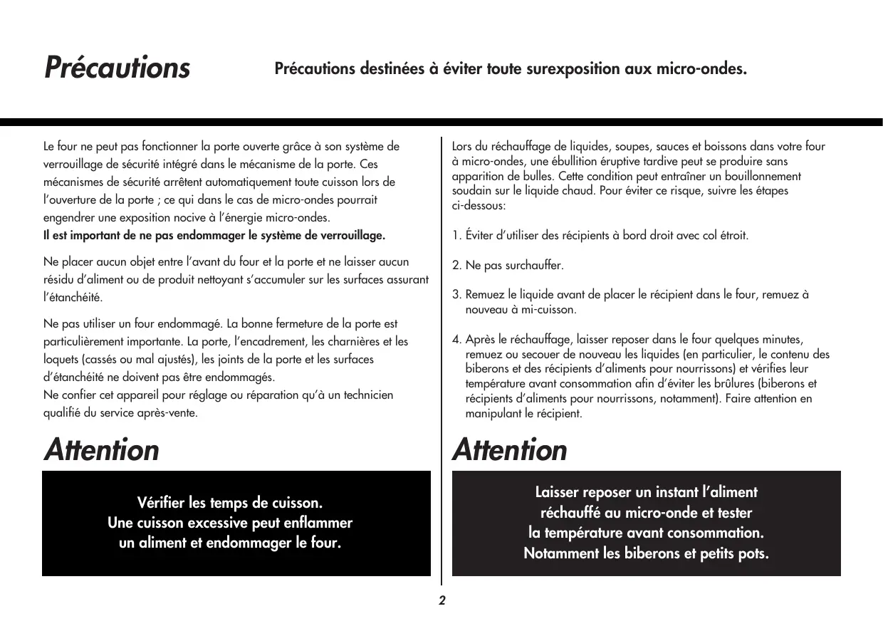 remuez ou secouer de nouveau les liquides (en particulier, le contenu des biberons et des récipients d’aliments pour nourrissons) et vérifies leur température avant consommation afin d’éviter les brûlures (biberons et récipients d’aliments pour nourrissons, notamment). Faire attention en manipulant le récipient. Attention Attention Laisser reposer un instant l’aliment réchauffé au micro-onde et tester la température avant consommation. Notamment les biberons et petits pots. Vérifier les temps de cuisson. Une cuisson excessive peut enflammer un aliment et endommager le four.