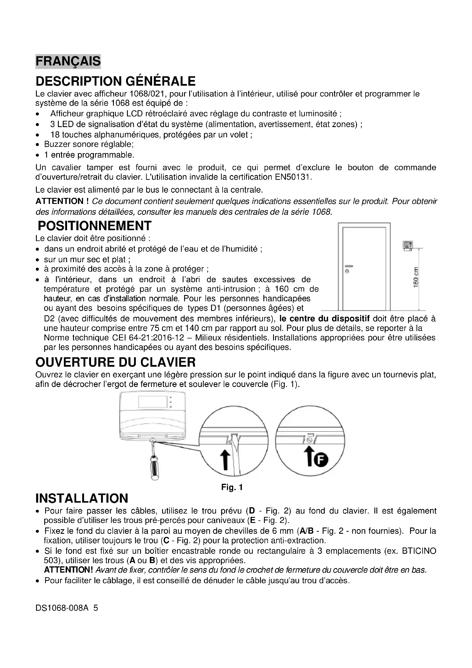 Le clavier avec afficheur 1068/021, pour l’utilisation à l’intérieur, utilisé pour contrôler et programmer le système de la série 1068 est équipé de : Afficheur graphique LCD rétroéclairé avec réglage du contraste et luminosité ; 3 LED de signalisation d’état du système (alimentation, avertissement, état zones) ; 18 touches alphanumériques, protégées par un volet ; Buzzer sonore réglable; 1 entrée programmable. Un cavalier tamper est fourni avec le produit, ce qui permet d’exclure le bouton de commande d’ouverture/retrait du clavier. L'utilisation invalide la certification EN50131. Le clavier est alimenté par le bus le connectant à la centrale. ATTENTION ! Ce document contient seulement quelques indications essentielles sur le produit. Pour obtenir des informations détaillées, consulter les manuels des centrales de la série 1068. POSITIONNEMENT Le clavier doit être positionné : dans un endroit abrité et protégé de l’eau et de l’humidité ; sur un mur sec et plat ; à proximité des accès à la zone à protéger ; à l'intérieur, dans un endroit à l’abri de sautes excessives de température et protégé par un système anti-intrusion ; à 160 cm de hauteur, en cas d’installation normale. Pour les personnes handicapées ou ayant des besoins spécifiques de types D1 (personnes âgées) et D2 (avec difficultés de mouvement des membres inférieurs), le centre du dispositif doit être placé à une hauteur comprise entre 75 cm et 140 cm par rapport au sol. Pour plus de détails, se reporter à la Norme technique CEI 64-21:2016-12 – Milieux résidentiels. Installations appropriées pour être utilisées par les personnes handicapées ou ayant des besoins spécifiques.