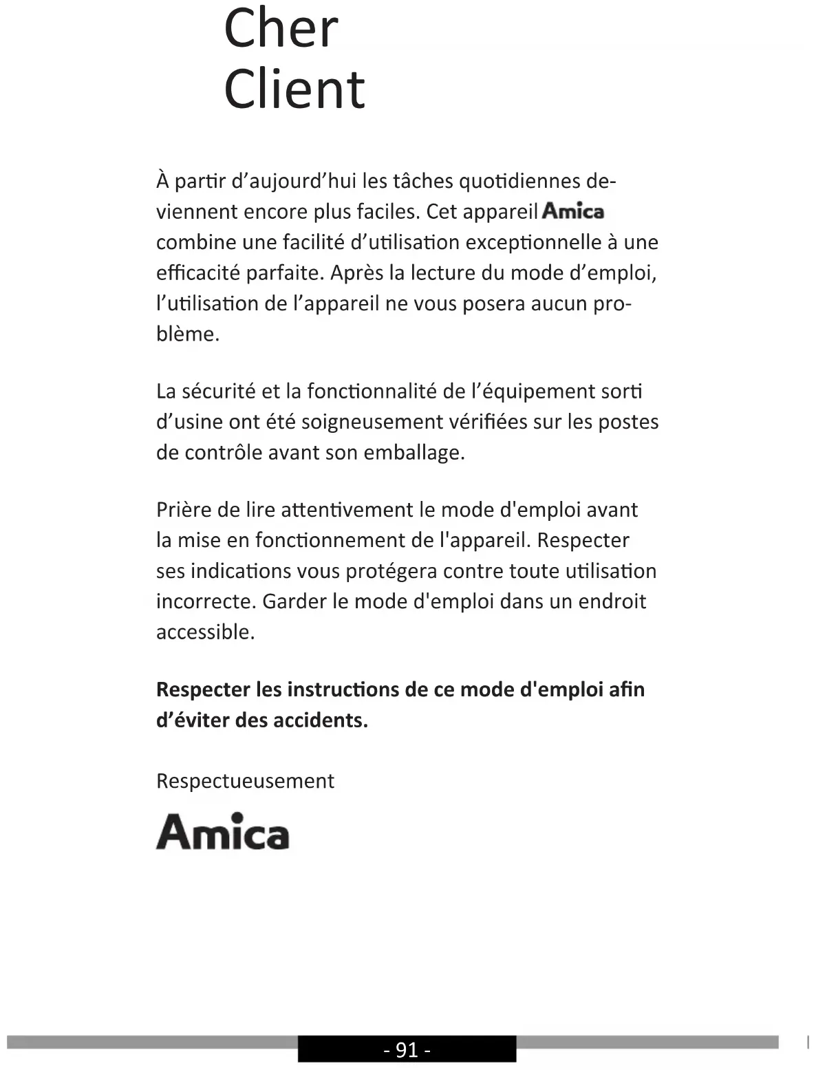 - Niederspannungsrichtlinie 2014/35/EU• Elektromagnetische Verträglichkeit 2014/30/EU• ErP – Richtlinie 2009/125/EC• Richtlinie RoHS 2011/65/EU Das Gerät ist mit dem Zeichen gekennzeichnet und verfügt über eine Konformitätserklärung zur Einsichtnahme durch die zuständigen Marktüberwa- chungsbehörden.- 91 - Cher Client À parr d’aujourd’hui les tâches quodiennes de- viennent encore plus faciles. Cet appareil combine une facilité d’ulisaon exceponnelle à une ecacité parfaite. Après la lecture du mode d’emploi, l’ulisaon de l’appareil ne vous posera aucun pro- blème. La sécurité et la fonconnalité de l’équipement sor d’usine ont été soigneusement vériées sur les postes de contrôle avant son emballage. Prière de lire aenvement le mode d'emploi avant la mise en fonconnement de l'appareil. Respecter ses indicaons vous protégera contre toute ulisaon incorrecte. Garder le mode d'emploi dans un endroit accessible. Respecter les instrucons de ce mode d'emploi an d’éviter des accidents. Respectueusement- 92 -