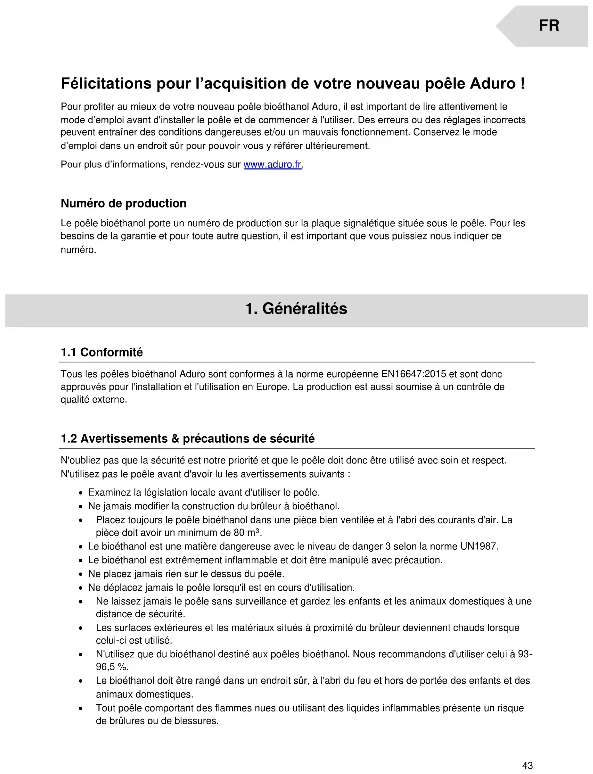 Félicitations pour l’acquisition de votre nouveau poêle Aduro ! Pour profiter au mieux de votre nouveau poêle bioéthanol Aduro, il est important de lire attentivement le mode d’emploi avant d'installer le poêle et de commencer à l'utiliser. Des erreurs ou des réglages incorrects peuvent entraîner des conditions dangereuses et/ou un mauvais fonctionnement. Conservez le mode d’emploi dans un endroit sûr pour pouvoir vous y référer ultérieurement. Pour plus d’informations, rendez-vous sur www.aduro.fr. Numéro de production Le poêle bioéthanol porte un numéro de production sur la plaque signalétique située sous le poêle. Pour les besoins de la garantie et pour toute autre question, il est important que vous puissiez nous indiquer ce numéro.
