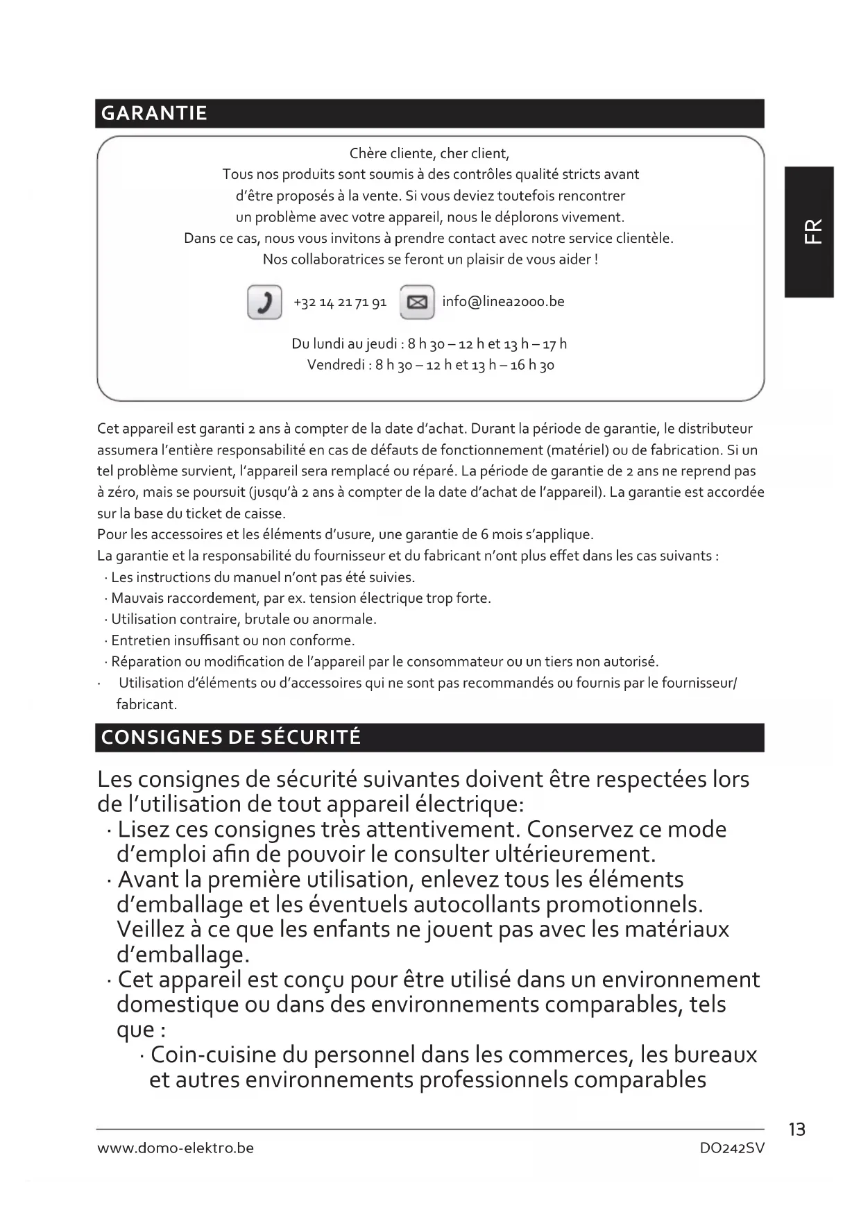- Vériez avant usage si la tension indiquée sur l’appareil correspond à la tension du réseau électrique de votre domicile.15 DO242SV www.domo-elektro.be
