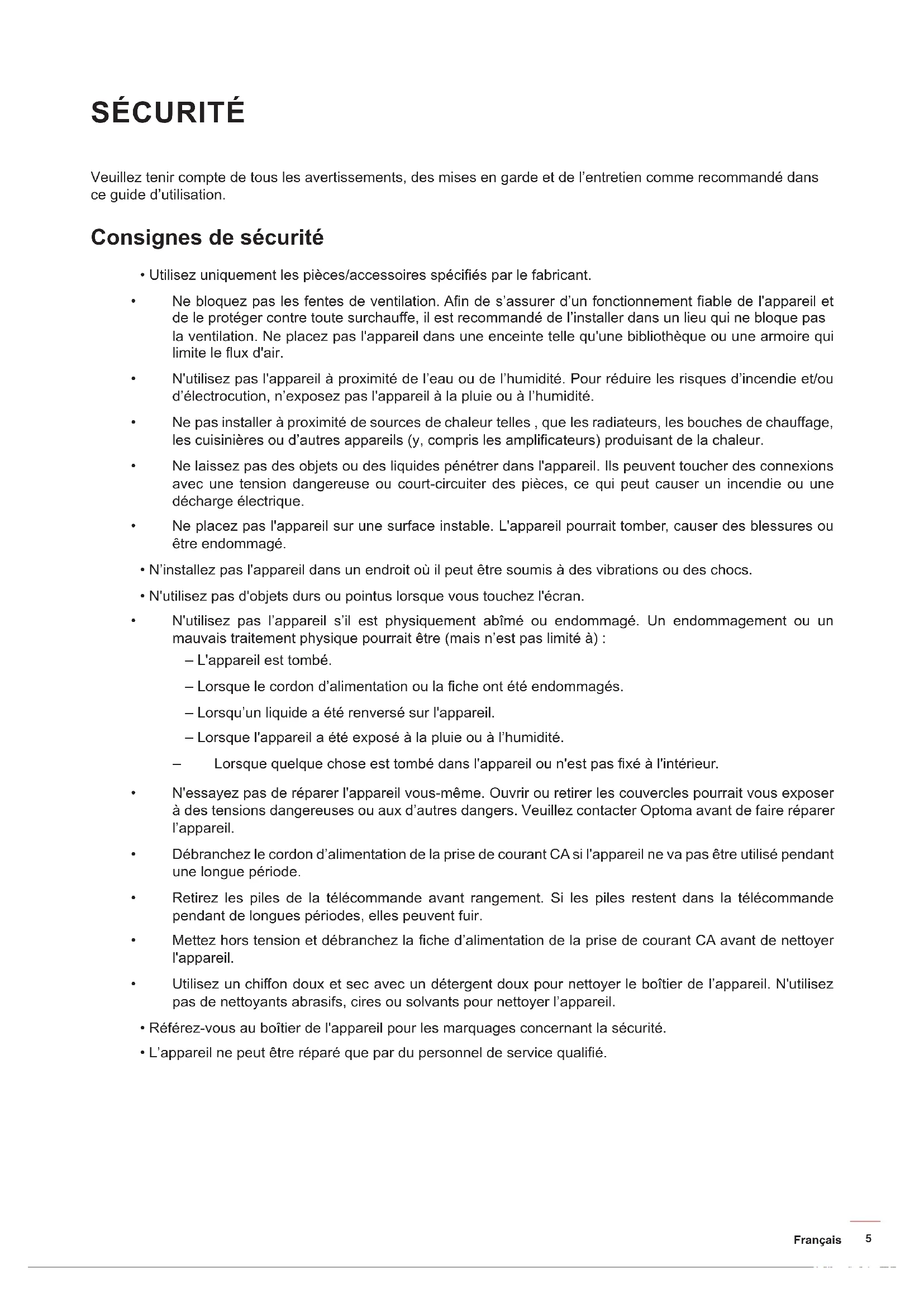 - N'essayez pas de réparer l'appareil vous-même. Ouvrir ou retirer les couvercles pourrait vous exposer à des tensions dangereuses ou aux d’autres dangers. Veuillez contacter Optoma avant de faire réparer l’appareil.