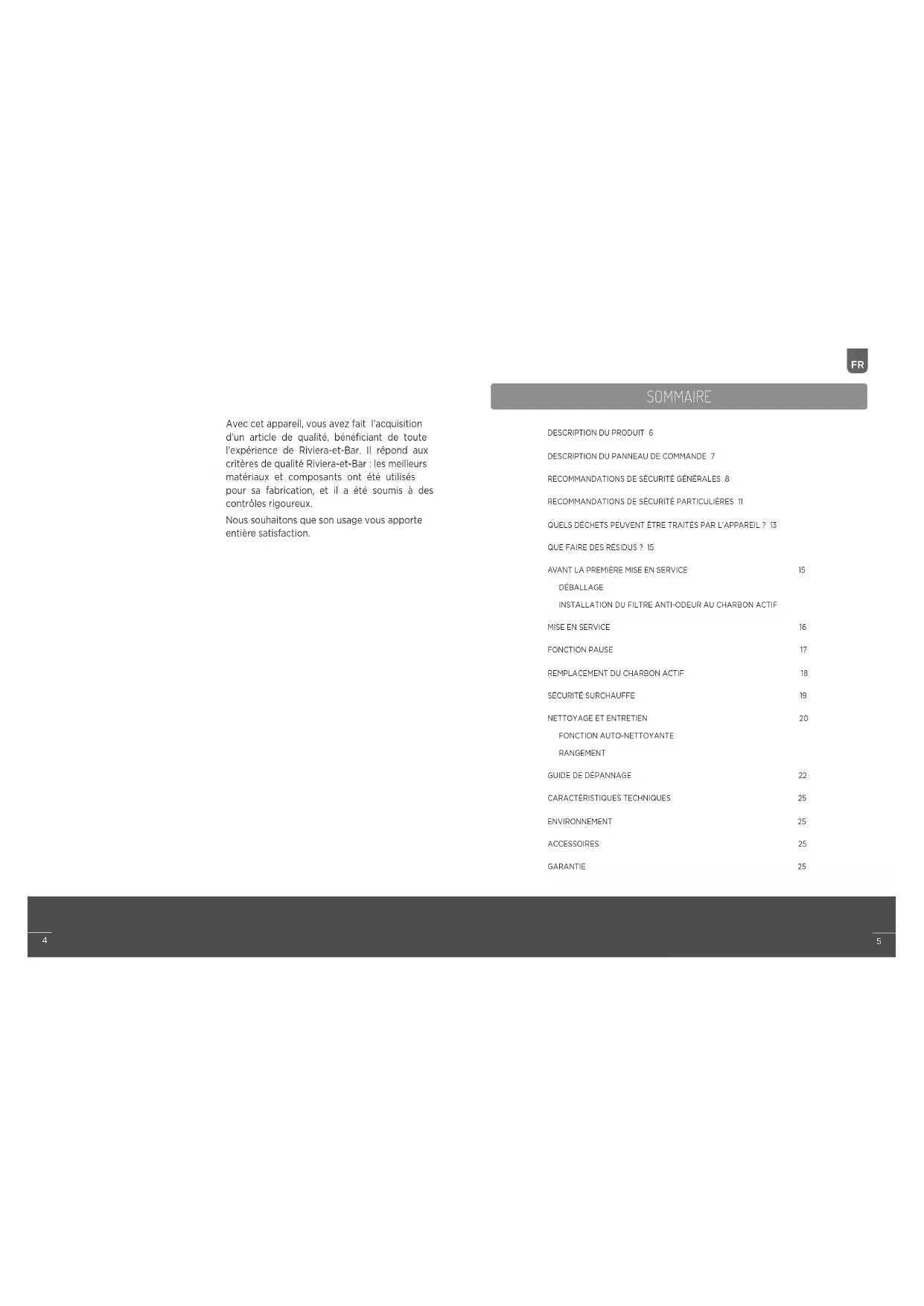 Avec cet appareil, vous avez fait l’acquisition d’un article de qualité, bénéficiant de toute l’expérience de Riviera-et-Bar. Il répond aux critères de qualité Riviera-et-Bar : les meilleurs matériaux et composants ont été utilisés pour sa fabrication, et il a été soumis à des contrôles rigoureux. Nous souhaitons que son usage vous apporte entière satisfaction.