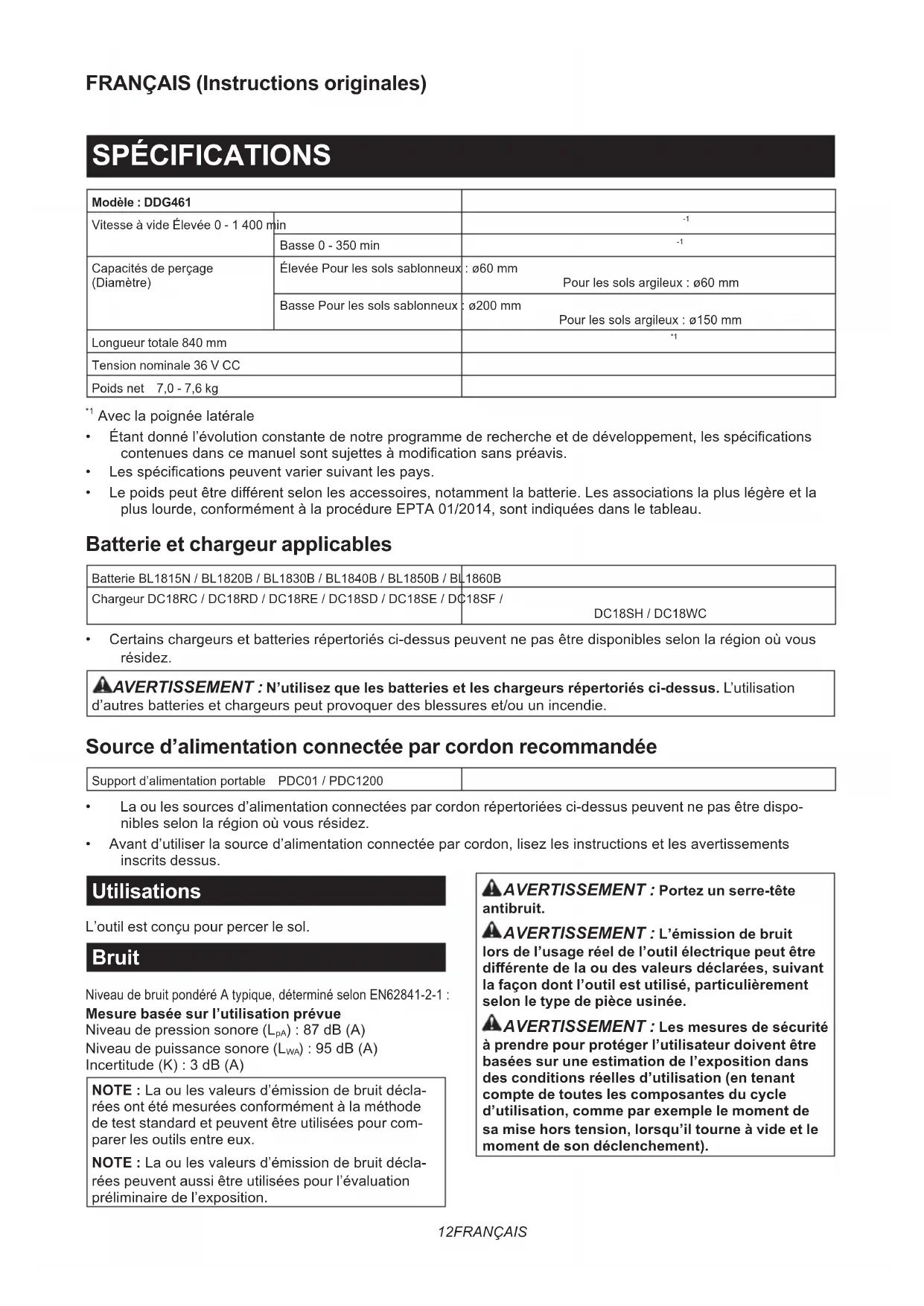 - Lepoidspeutêtrediérentselonlesaccessoires,notammentlabatterie.Lesassociationslapluslégèreetla pluslourde,conformémentàlaprocédureEPTA01/2014,sontindiquéesdansletableau. Batterie et chargeur applicables Batterie BL1815N/BL1820B/BL1830B/BL1840B/BL1850B/BL1860B Chargeur DC18RC/DC18RD/DC18RE/DC18SD/DC18SE/DC18SF/ DC18SH/DC18WC