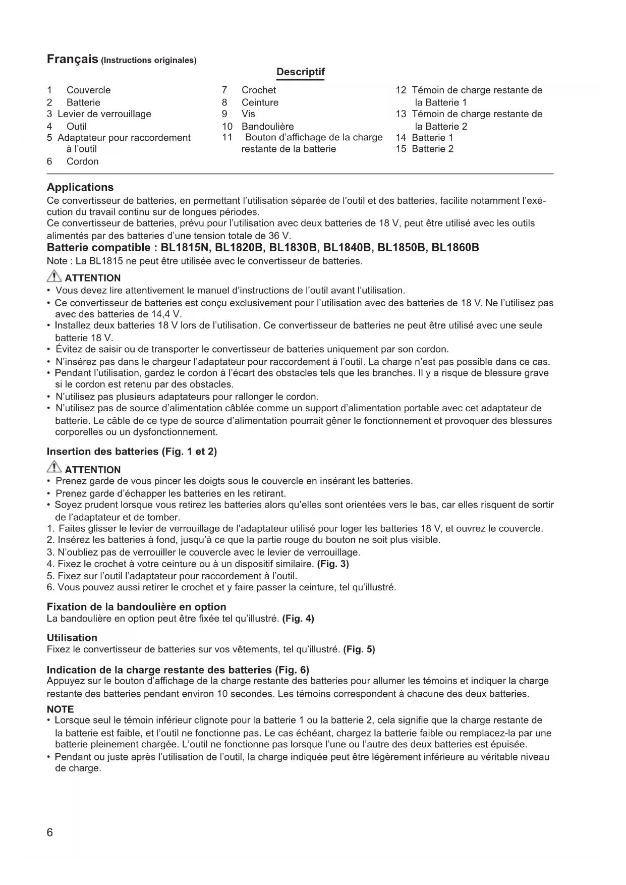 Le moteur s’arrête automatiquement quand le BCV01 détecte une tension de batterie anormalement élevée. Cet arrêt est causé par la fonction de protection du BCV01, et non par un dysfonctionnement. Le cas échéant, le moteur reste arrêté même si vous activez les interrupteurs. Retirez les batteries du BCV01 et utilisez d’autres batteries, d’une tension normale. NOTE Si l’outil s’arrête automatiquement sans aucune indication sur le BCV01 Lorsque l’outil est soumis à une surcharge, l’alimentation s’arrête automatiquement pour prolonger la durée de ser- vice de la batterie. Cet arrêt est causé par la fonction de protection des batteries, et non par un dysfonctionnement. De plus le BCV01 n’indique rien dans ce cas, mais il ne s’agit pas d’un dysfonctionnement. Le cas échéant, libérez l’interrupteur et corrigez la cause de la surcharge. Vous pouvez alors utiliser l’outil de nouveau en réactivant l’inter- rupteur.9 1 Abdeckung 2 Akku 3 Verriegelungshebel 4 Produkt 5 Produkt-Montageadapter 6 Kabel 7 Haken 8 Gürtel 9 Schraube 10 Schulterriemen 11 Akkukapazität-Anzeigetaste 12 Akku-Restkapazitäts-Anzei- gelampe für Akku 1 13 Akku-Restkapazitäts-Anzei- gelampe für Akku 2 14 Akku 1 15 Akku 2 Deutsch (Originale Anleitungen) Übersicht Anwendungen Dieser Akkukonverter ermöglicht es, Hauptgerät und Akkus zu trennen, und eignet sich somit für Arbeiten, die über längere Zeitspannen durchgeführt werden usw. Dieser Akkukonverter verwendet zwei 18-V-Akkus und kann mit 36-V-Akkugeräten eingesetzt werden. Kompatibler Akku: BL1815N, BL1820B, BL1830B, BL1840B, BL1850B, BL1860B Hinweis: BL1815 kann nicht mit die Akkukonverter verwendet werden. VORSICHT