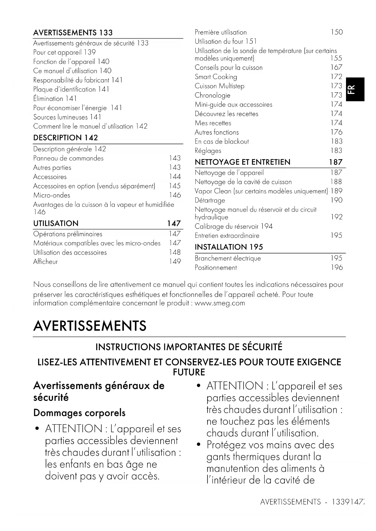 AVERTISSEMENTS 133Avertissements généraux de sécurité 133Pour cet appareil 139Fonction de l’appareil 140Ce manuel d’utilisation 140Responsabilité du fabricant 141Plaque d’identification 141Élimination 141Pour économiser l’énergie 141Sources lumineuses 141Comment lire le manuel d’utilisation 142DESCRIPTION 142Description générale 142Panneau de commandes 143Autres parties 143Accessoires 144Accessoires en option (vendus séparément) 145Micro-ondes 146Avantages de la cuisson à la vapeur et humidifiée UTILISATION 147Opérations préliminaires 147Matériaux compatibles avec les micro-ondes 147Utilisation des accessoires 148Afficheur 149Première utilisation 150Utilisation du four 151Utilisation de la sonde de température (sur certains modèles uniquement) 155Conseils pour la cuisson 167Smart Cooking 172Cuisson Multistep 173Chronologie 173Mini-guide aux accessoires 174Découvrez les recettes 174Mes recettes 174Autres fonctions 176En cas de blackout 183Réglages 183NETTOYAGE ET ENTRETIEN 187Nettoyage de l’appareil 187Nettoyage de la cavité de cuisson 188Vapor Clean (sur certains modèles uniquement) 189Détartrage 190Nettoyage manuel du réservoir et du circuit hydraulique 192Calibrage du réservoir 194Entretien extraordinaire 195INSTALLATION 195Branchement électrique 195Positionnement 196 Nous conseillons de lire attentivement ce manuel qui contient toutes les indications nécessaires pour préserver les caractéristiques esthétiques et fonctionnelles de l’appareil acheté. Pour toute information complémentaire concernant le produit : www.smeg.com AVERTISSEMENTS
