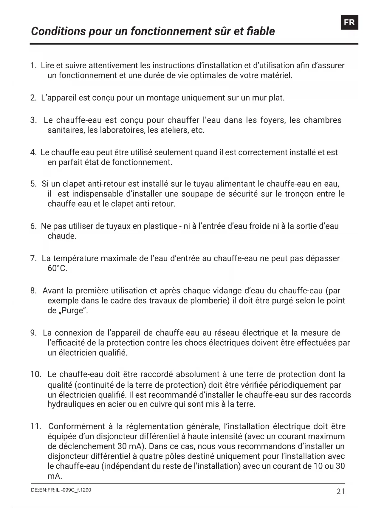 équipée d’un disjoncteur différentiel à haute intensité (avec un courant maximum de déclenchement 30 mA). Dans ce cas, nous vous recommandons d’installer un disjoncteur différentiel à quatre pôles destiné uniquement pour l’installation avec le chauffe-eau (indépendant du reste de l’installation) avec un courant de 10 ou 30 mA. Conditions pour un fonctionnement sûr et able FR22