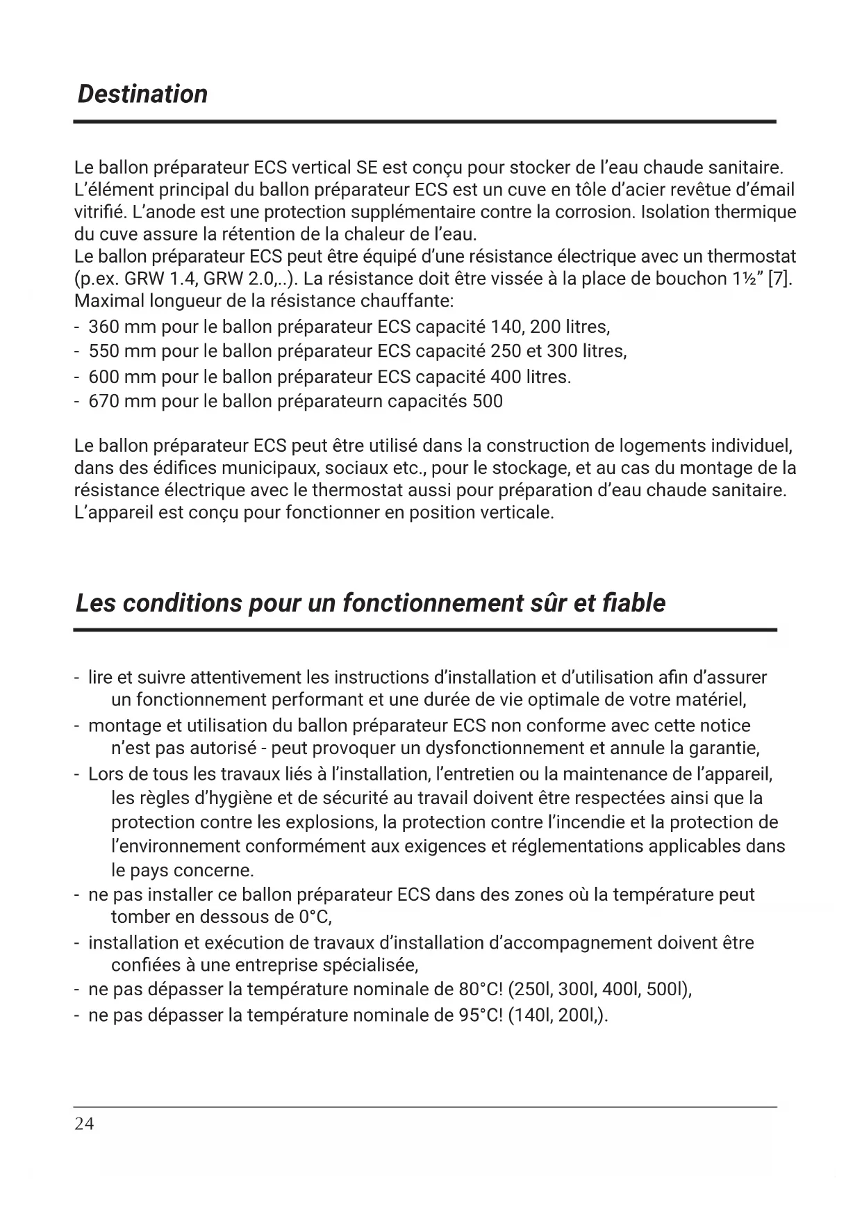 AMW. M8.400 EN24 Le ballon préparateur ECS vertical SE est conçu pour stocker de l’eau chaude sanitaire. L’élément principal du ballon préparateur ECS est un cuve en tôle d’acier revêtue d’émail vitrié. L’anode est une protection supplémentaire contre la corrosion. Isolation thermique du cuve assure la rétention de la chaleur de l’eau. Le ballon préparateur ECS peut être équipé d’une résistance électrique avec un thermostat (p.ex. GRW 1.4, GRW 2.0,..). La résistance doit être vissée à la place de bouchon 1½” [7]. Maximal longueur de la résistance chauffante: - 360 mm pour le ballon préparateur ECS capacité 140, 200 litres, - 550 mm pour le ballon préparateur ECS capacité 250 et 300 litres, - 600 mm pour le ballon préparateur ECS capacité 400 litres. - 670 mm pour le ballon préparateurn capacités 500 Le ballon préparateur ECS peut être utilisé dans la construction de logements individuel, dans des édices municipaux, sociaux etc., pour le stockage, et au cas du montage de la résistance électrique avec le thermostat aussi pour préparation d’eau chaude sanitaire. L’appareil est conçu pour fonctionner en position verticale. - lire et suivre attentivement les instructions d’installation et d’utilisation an d’assurer un fonctionnement performant et une durée de vie optimale de votre matériel, - montage et utilisation du ballon préparateur ECS non conforme avec cette notice n’est pas autorisé - peut provoquer un dysfonctionnement et annule la garantie, - Lors de tous les travaux liés à l’installation, l’entretien ou la maintenance de l’appareil, les règles d’hygiène et de sécurité au travail doivent être respectées ainsi que la protection contre les explosions, la protection contre l’incendie et la protection de l’environnement conformément aux exigences et réglementations applicables dans le pays concerne. - ne pas installer ce ballon préparateur ECS dans des zones où la température peut tomber en dessous de 0°C, - installation et exécution de travaux d’installation d’accompagnement doivent être conées à une entreprise spécialisée, - ne pas dépasser la température nominale de 80°C! (250l, 300l, 400l, 500l), - ne pas dépasser la température nominale de 95°C! (140l, 200l,). Destination Les conditions pour un fonctionnement sûr et able25 PL;EN;DE;FR-042_f.1640