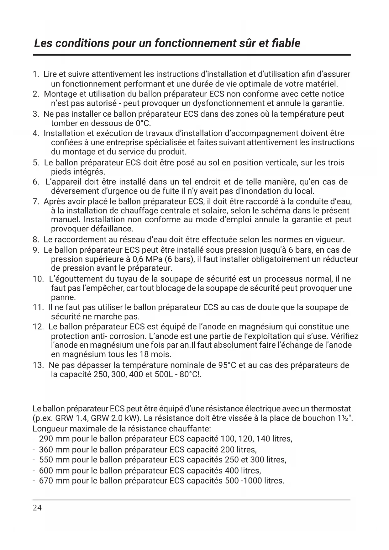 la capacité 250, 300, 400 et 500L - 80°C!. Le ballon préparateur ECS peut être équipé d’une résistance électrique avec un thermostat (p.ex. GRW 1.4, GRW 2.0 kW). La résistance doit être vissée à la place de bouchon 1½″. Longueur maximale de la résistance chauffante: - 290 mm pour le ballon préparateur ECS capacité 100, 120, 140 litres, - 360 mm pour le ballon préparateur ECS capacité 200 litres, - 550 mm pour le ballon préparateur ECS capacités 250 et 300 litres, - 600 mm pour le ballon préparateur ECS capacités 400 litres, - 670 mm pour le ballon préparateur ECS capacités 500 -1000 litres.25 DE;EN;FR-036_f.1638 Le raccordement au circuit de chauffage central Le raccordement au installation de chauffage central doit être effectué avec raccords 1″ (1½″ - 1000l) et avant les raccords il faut installer des vannes d’arrêt. Dans les systèmes à circulation forcée (pompe de chauffage central) pour que le ballon préparateur ECS atteigne les performances indiquées dans le tableau „Donnés Techniques” le débit approprié d’eau chauffante doit être assurée. Le ballon préparateur ECS modèle SW est équipé d’un serpentin, modèle SB est équipé de deux serpentins permettant le raccordement par exemple de la chaudière et du système solaire. Modèles SWZ et SBZ sont équipés des raccords supplémentaires, qui peuvent être utilisés pour connecter un échangeur de chaleur externe.