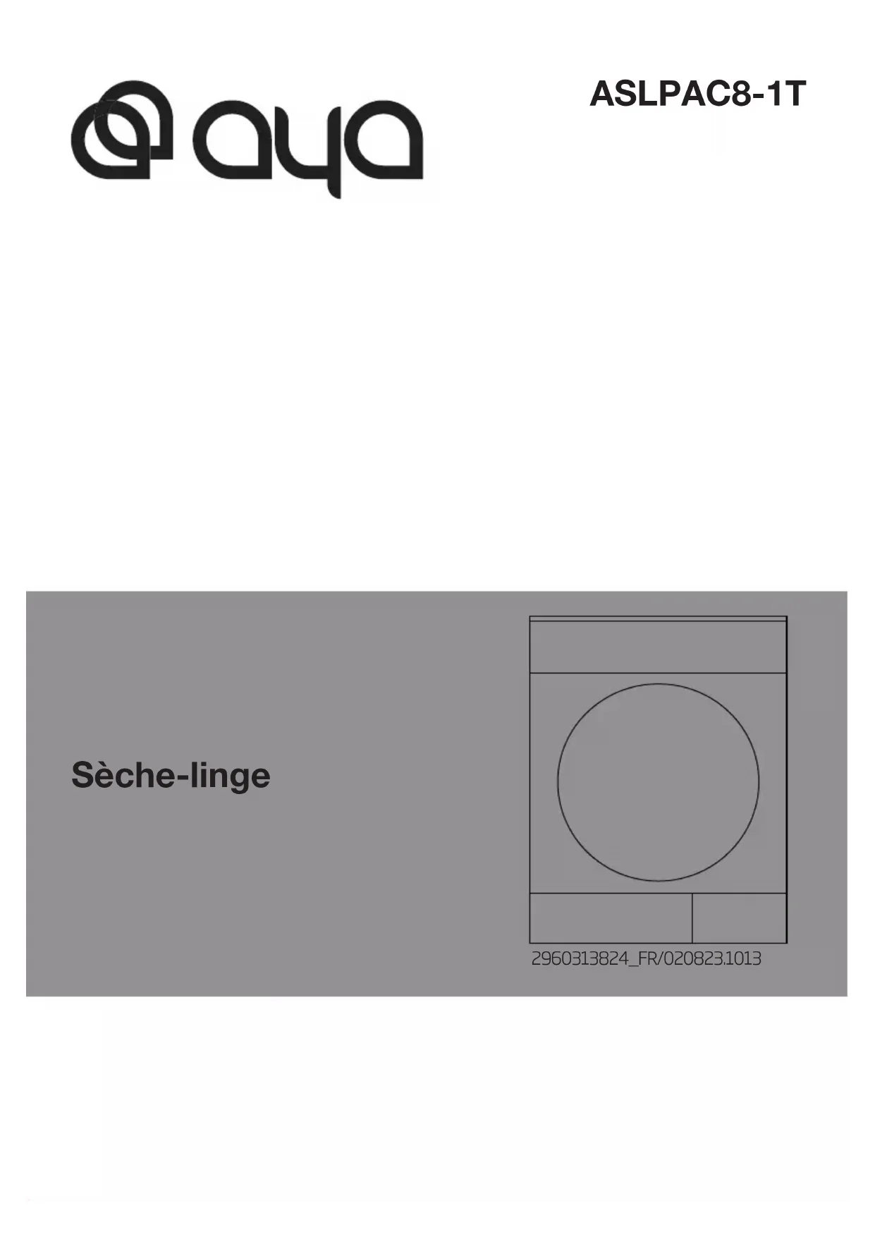 Sèche-linge 2960313824_FR/020823.1013 ASLPAC8-1TCe produit a été fabriqué à l’aide de la technologie de pointe et dans des conditions respectueuses de l’environnement Veuillez d’abord lire ce manuel ! Chère cliente, cher client, Nous vous remercions d’avoir choisi un appareil Aya Nous espérons que votre appareil qui a été fabriqué avec des matériaux de haute qualité et une technologie de pointe vous offrira les meilleurs résultats. Nous vous conseillons de lire attentivement ce manuel et tout autre document fourni avant d’utiliser votre appareil et de le conserver à titre de référence. Si vous cédez l’appareil à quelqu’un d’autre, donnez-lui aussi le manuel. Prêtez attention à tous les détails et aux mises en garde indiquées dans le manuel d’utilisation et suivez les instructions qui y sont inscrites. Utilisez ce manuel d’utilisateur pour le modèle indiqué sur la page de couverture.