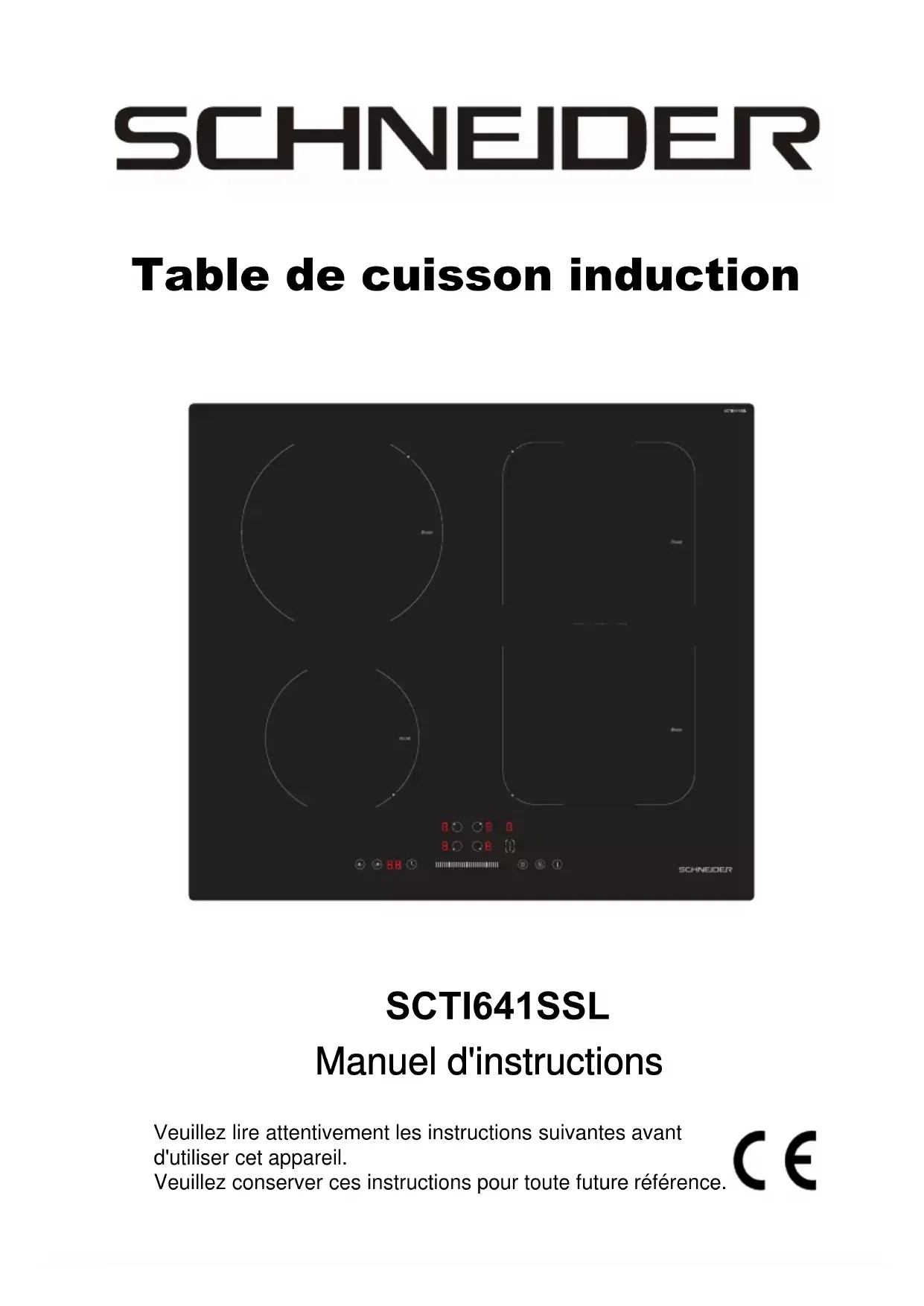 Table de cuisson induction SCTI641SSL Manuel d'instructions Veuillez lire attentivement les instructions suivantes avant d'utiliser cet appareil. Veuillez conserver ces instructions pour toute future référence.FR-2 Toutes nos félicitations pour l’achat de votre nouvelle plaque à Induction. Nous vous recommandons de prendre le temps de lire ce mode d’emploi / manuel d’installation afin de bien comprendre comment l’installer et l'utiliser correctement. Pour l’installation, veuillez lire le chapitre Installation. Lisez toutes les instructions de sécurité attentivement avant l’utilisation et conservez ce mode d’emploi / manuel d’installation pour une future référence. Consignes de sécurité Cet appareil est destiné à un usage domestique. MISE EN GARDE: Cet appareil et ses parties accessibles deviennent chauds pendant leur utilisation. Il convient de veiller à ne pas toucher les éléments chauffants. Il convient de maintenir à distance les enfants de moins de 8 ans, à moins qu'ils ne soient sous une surveillance permanente . Cet appareil peut être utilisé par des enfants à partir de 8 ans etFR-3 par des personnes ayant des capacités physiques, sensorielles ou mentales réduites ou un manque d’expérience et de connaissances à condition qu’elles aient été placées sous surveillance ou qu'elles aient reçu des instructions concernant l’utilisation de l’appareil en toute sécurité et qu’elles comprennent les dangers encourus. Les enfants ne doivent pas jouer avec l’appareil. Le nettoyage et l’entretien par l’usager ne doivent pas être effectués par des enfants, sans surveillance. MISE EN GARDE: Laisser cuire des aliments sans surveillance sur une table de cuisson en utilisant des matières grasses ou de l'huile peut être dangereux etFR-4 déclencher un incendie.