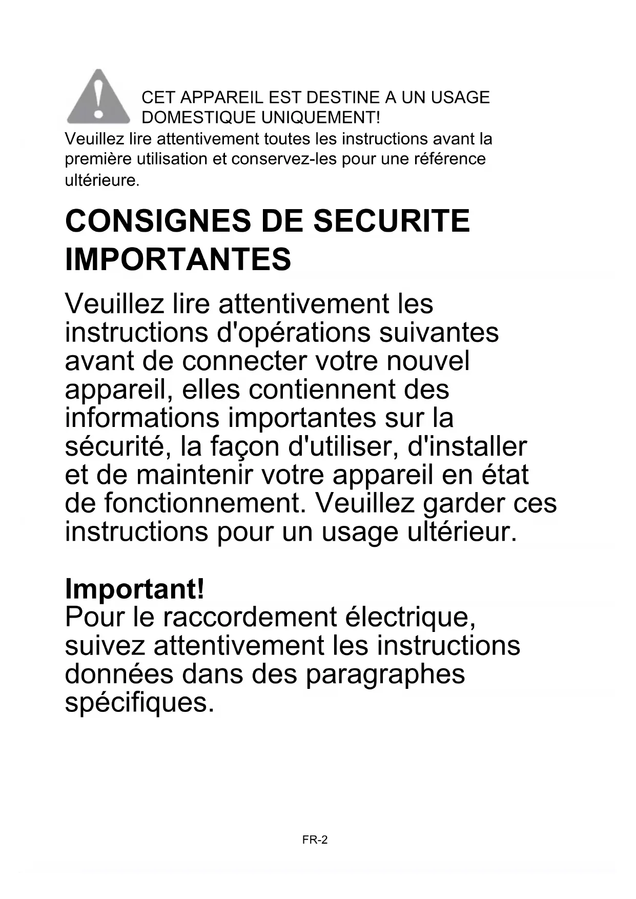 IMPORTANTES Veuillez lire attentivement les instructions d'opérations suivantes avant de connecter votre nouvel appareil, elles contiennent des informations importantes sur la sécurité, la façon d'utiliser, d'installer et de maintenir votre appareil en état de fonctionnement. Veuillez garder ces instructions pour un usage ultérieur. Important! Pour le raccordement électrique, suivez attentivement les instructions données dans des paragraphes spécifiques.1. Cet appareil peut être utilisé par des enfants à partir de 8 ans et par des personnes ayant des capacités physiques, sensorielles ou mentales réduites ou un manque d'expérience et de connaissances à condition qu'elles aient été placées sous surveillance ou qu'elles aient reçu des instructions concernant l'utilisation de l'appareil en toute sécurité et qu'elles comprennent les dangers encourus. Les enfants ne doivent pas jouer avec l'appareil. Le nettoyage et l'entretien par l'usager ne doivent pas être effectués par des enfants, sans surveillance.