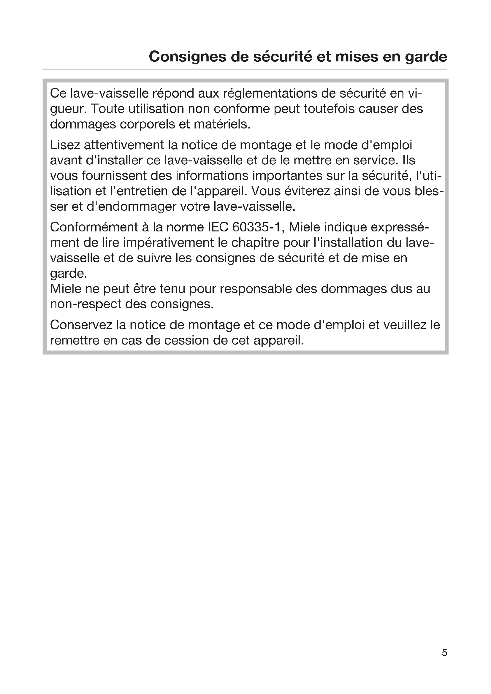 Ce lave-vaisselle répond aux réglementations de sécurité en vi- gueur. Toute utilisation non conforme peut toutefois causer des dommages corporels et matériels. Lisez attentivement la notice de montage et le mode d'emploi avant d'installer ce lave-vaisselle et de le mettre en service. Ils vous fournissent des informations importantes sur la sécurité, l'uti- lisation et l'entretien de l'appareil. Vous éviterez ainsi de vous bles- ser et d'endommager votre lave-vaisselle. Conformément à la norme IEC60335-1, Miele indique expressé- ment de lire impérativement le chapitre pour l'installation du lave- vaisselle et de suivre les consignes de sécurité et de mise en garde. Miele ne peut être tenu pour responsable des dommages dus au non-respect des consignes. Conservez la notice de montage et ce mode d'emploi et veuillez le remettre en cas de cession de cet appareil.Consignes de sécurité et mises en garde