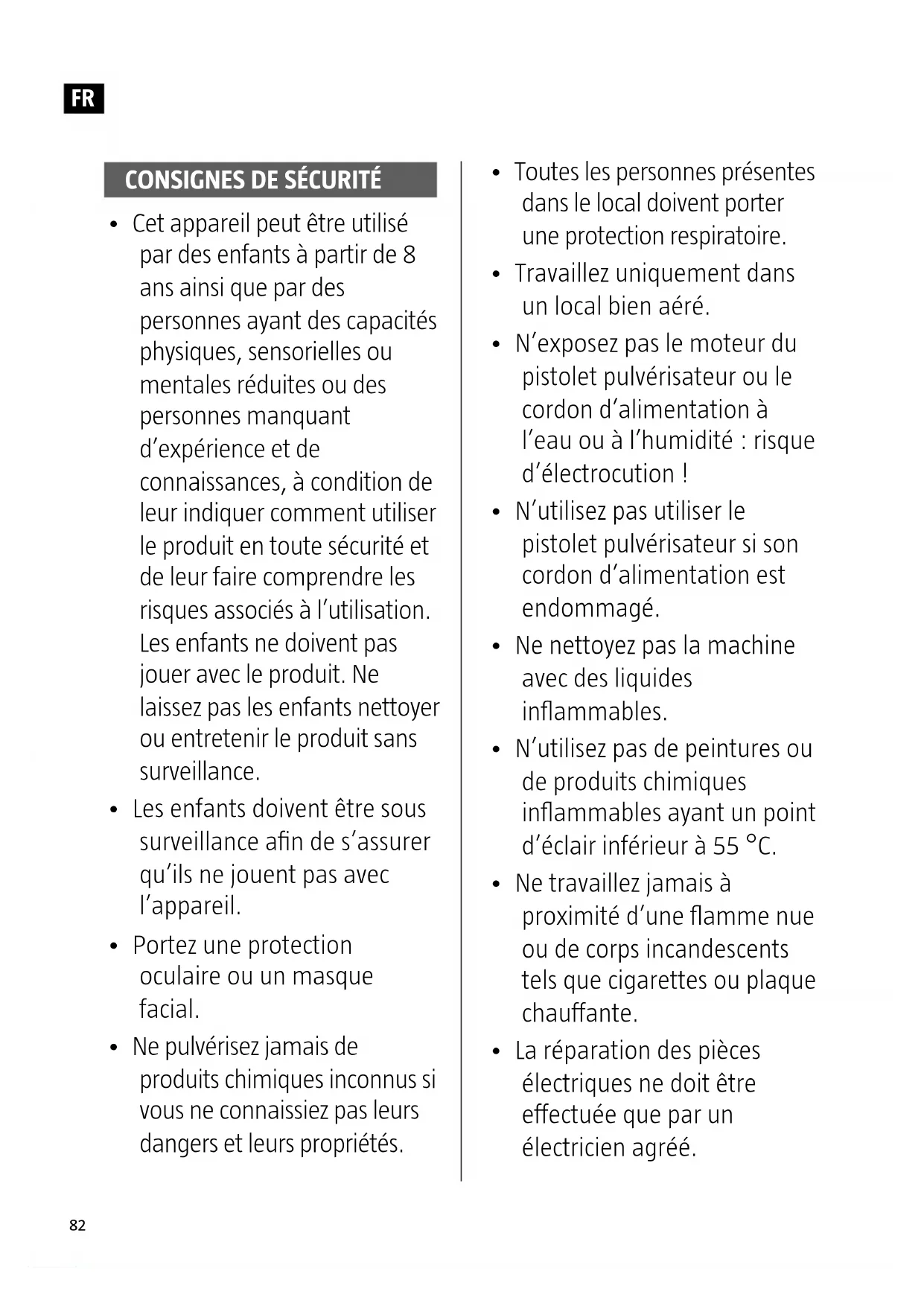 - N’utilisez pas utiliser le pistolet pulvérisateur si son cordon d’alimentation est endommagé.