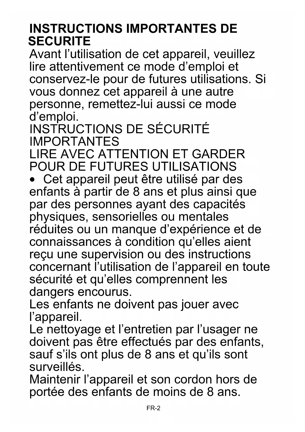 Cet appareil peut être utilisé par des enfants à partir de 8 ans et plus ainsi que par des personnes ayant des capacités physiques, sensorielles ou mentales réduites ou un manque d’expérience et de connaissances à condition qu’elles aient reçu une supervision ou des instructions concernant l’utilisation de l’appareil en toute sécurité et qu’elles comprennent les dangers encourus. Les enfants ne doivent pas jouer avec l’appareil. Le nettoyage et l’entretien par l’usager ne doivent pas être effectués par des enfants, sauf s’ils ont plus de 8 ans et qu’ils sont surveillés. Maintenir l’appareil et son cordon hors de portée des enfants de moins de 8 ans.FR-3