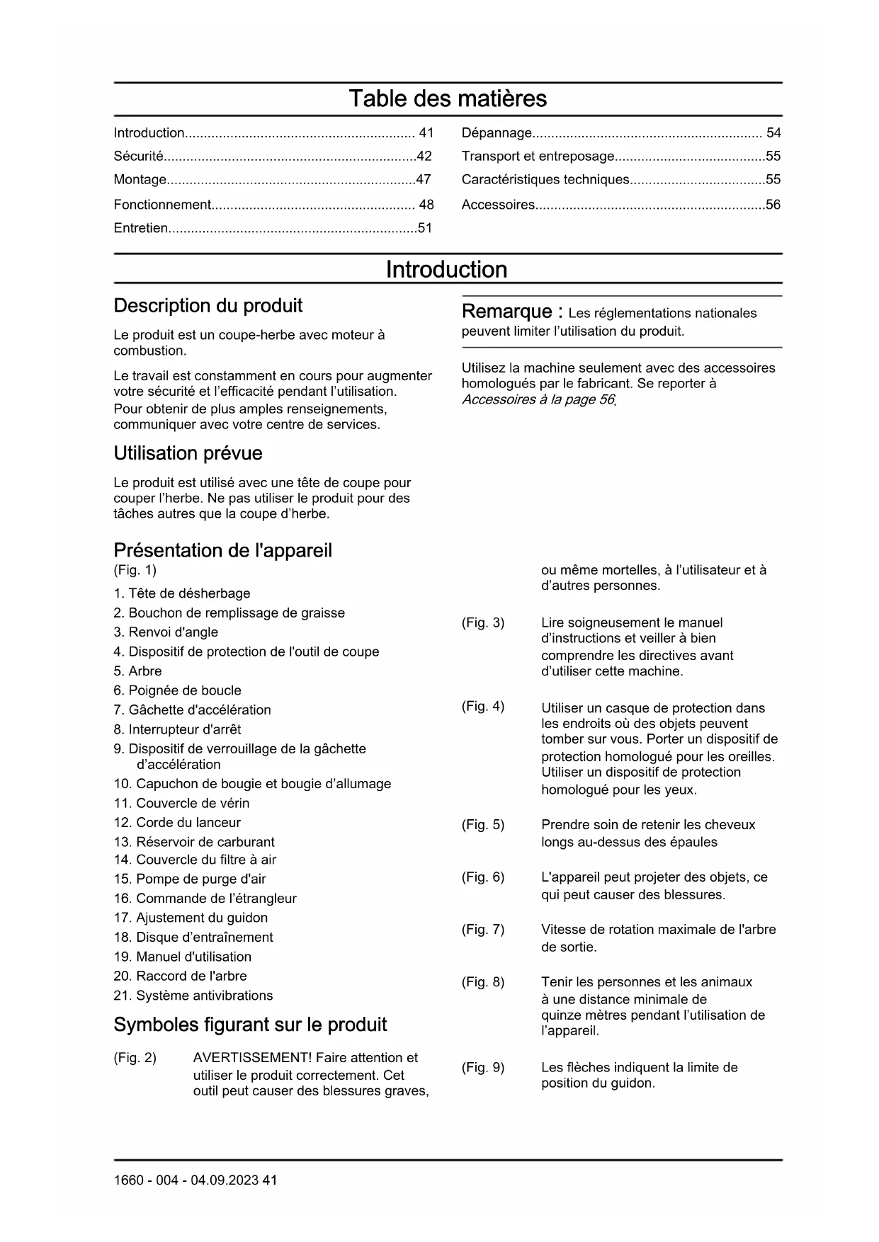 Symboles figurant sur le produit (Fig. 2) AVERTISSEMENT! Faire attention et utiliser le produit correctement. Cet outil peut causer des blessures graves, ou même mortelles, à l’utilisateur et à d’autres personnes. (Fig. 3) Lire soigneusement le manuel d’instructions et veiller à bien comprendre les directives avant d’utiliser cette machine. (Fig. 4) Utiliser un casque de protection dans les endroits où des objets peuvent tomber sur vous. Porter un dispositif de protection homologué pour les oreilles. Utiliser un dispositif de protection homologué pour les yeux. (Fig. 5) Prendre soin de retenir les cheveux longs au-dessus des épaules (Fig. 6) L'appareil peut projeter des objets, ce qui peut causer des blessures. (Fig. 7) Vitesse de rotation maximale de l'arbre de sortie. (Fig. 8) Tenir les personnes et les animaux à une distance minimale de quinze mètres pendant l’utilisation de l’appareil. (Fig. 9) Les flèches indiquent la limite de position du guidon. 1660 - 004 - 04.09.2023 41(Fig. 10) Pompe à carburant. (Fig. 11) Volet de départ. (Fig. 12) Carburant. yyyywwxxxx La plaque signalétique in- dique le numéro de sé- rie.yyyy représente l'an- née de production, ww in- dique la semaine de pro- duction. Remarque: Les autres symboles et autocollants apposés sur le produit se rapportent aux exigences en matière de certification pour certains marchés. EPAIII (Fig. 13) La période de conformité aux normes d’émissions indiquée sur les étiquettes de conformité aux normes d’émissions se rapporte au nombre d’heures de fonctionnement du moteur qui répond aux exigences fédérales en matière d’émissions. N’importe quel établissement ou agent de réparation de moteur non routier peut effectuer l’entretien, le remplacement et la réparation des dispositifs et du système de contrôle des émissions. ABRÉVIATIONS SUR LES ÉTIQUETTES DU SYSTÈME DE CONTRÔLE DES ÉMISSIONS Généralités : EXH/EVP Échappement et éva- poration REGS Règlements DISPL Cylindrée EVAP Évaporation SORE Petits moteurs hors route ECS Système de contrôle des émissions HRS Heures US EPA Office de protection de l'environnement des États-Unis Système de contrôle des émissions d’échappe- ment : ECM Module de com- mande du moteur (Autotune) OC Catalyseur oxy- dant EM Modification du moteur TWC Catalyseur tri- fonctionnel Systèmes de contrôle des émissions par évapora- tion : C Coextrudé (multi- couche) P Polyéthylène ou polyéthylène haute densité traité Systèmes de contrôle des émissions par évapora- tion : N Nylon S Fermé herméti- quement Produit endommagé Nous ne sommes pas responsables des dommages causés à notre produit si: