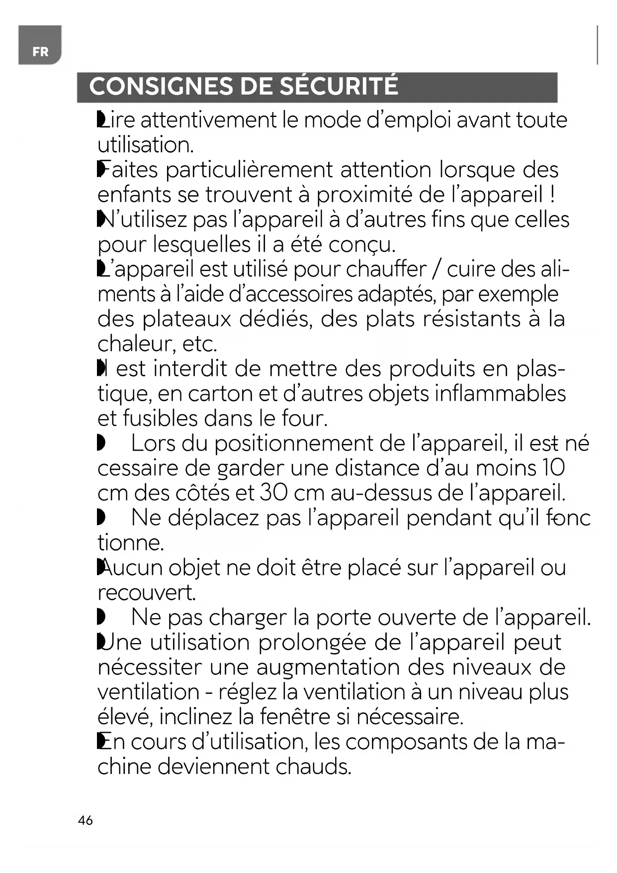 Aucun objet ne doit être placé sur l’appareil ou recouvert. Ne pas charger la porte ouverte de l’appareil.